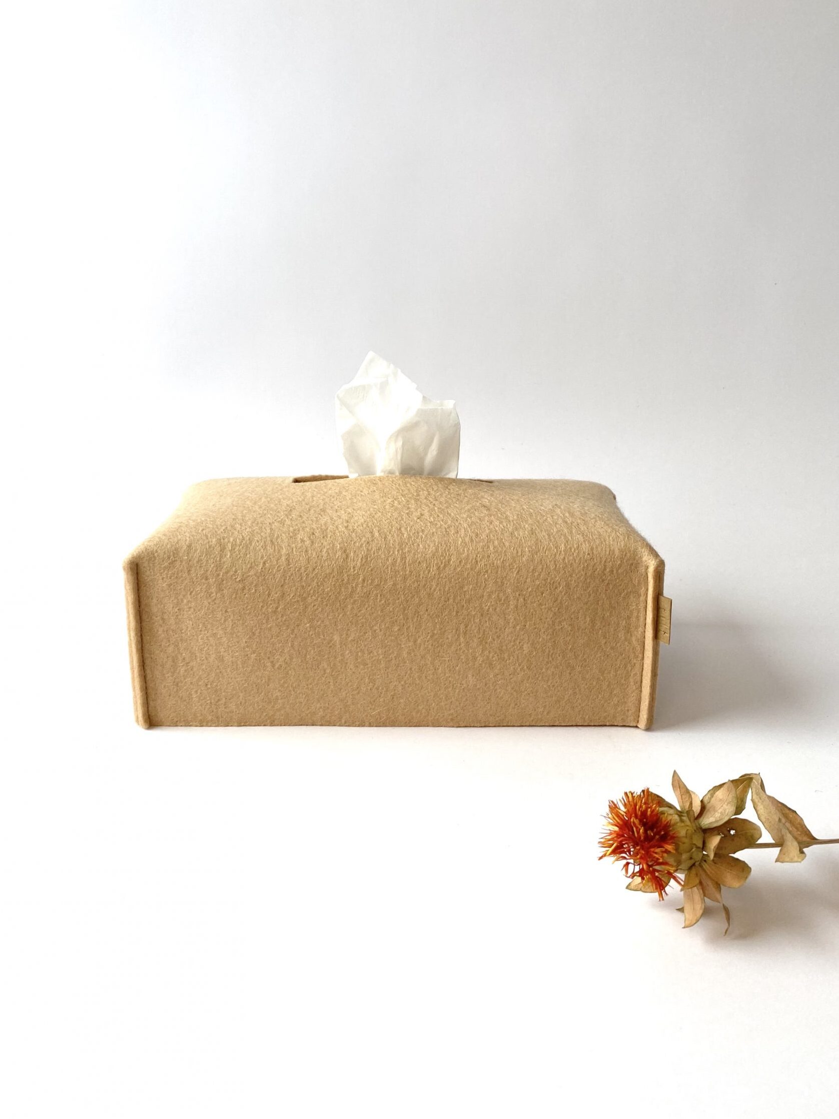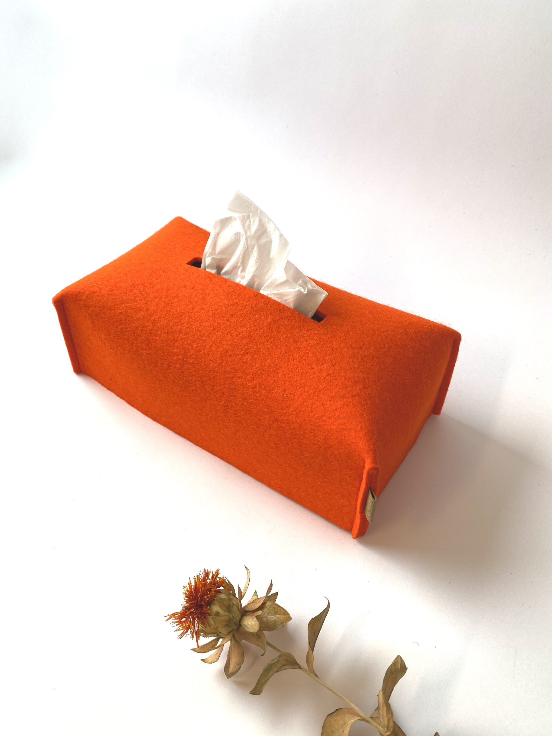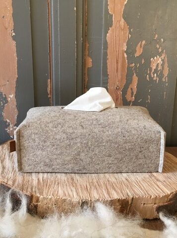 Wil je in je badkamer, keuken of praktijk je tissuebox een beetje in stijl presenteren? Deze tissueboxcover kun je in verschillende kleuren bestellen. Zie de laatste 3 foto’s voor de verkrijgbare kleuren. Hij wordt speciaal voor jou gemaakt van zacht wolvilt (100% wol); 3 mm dik. Slow Made in 3 uur.