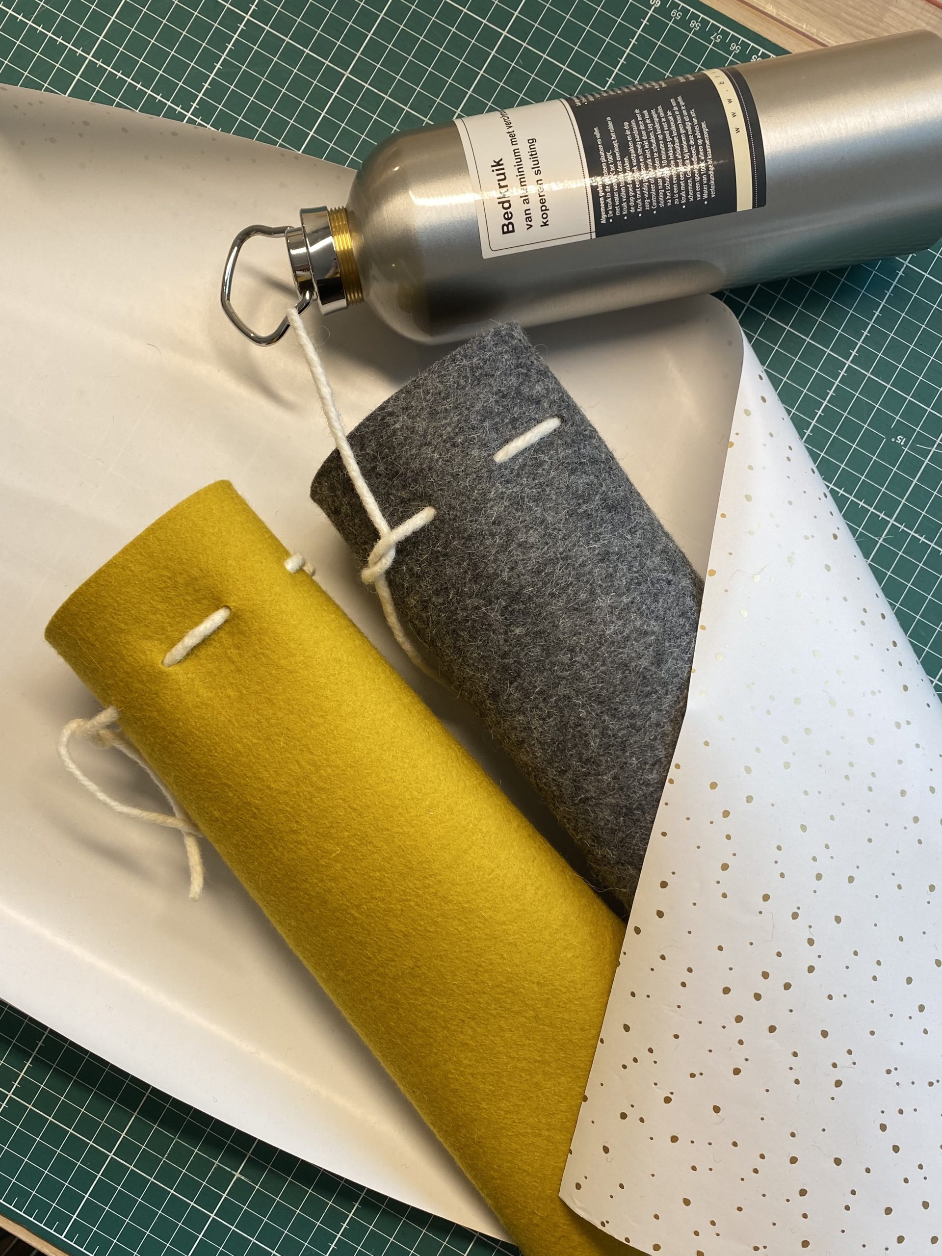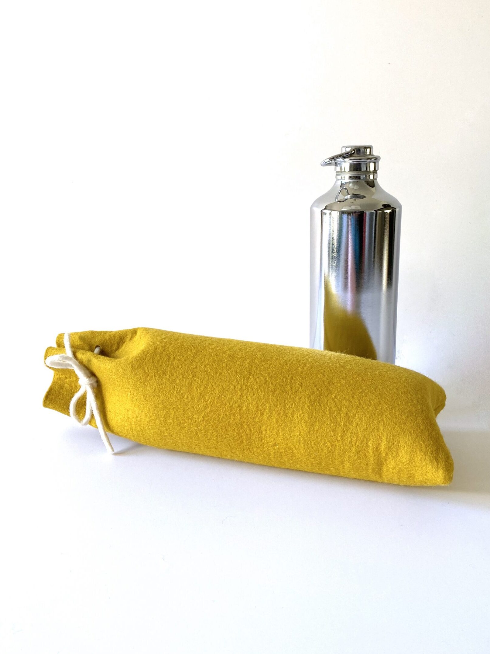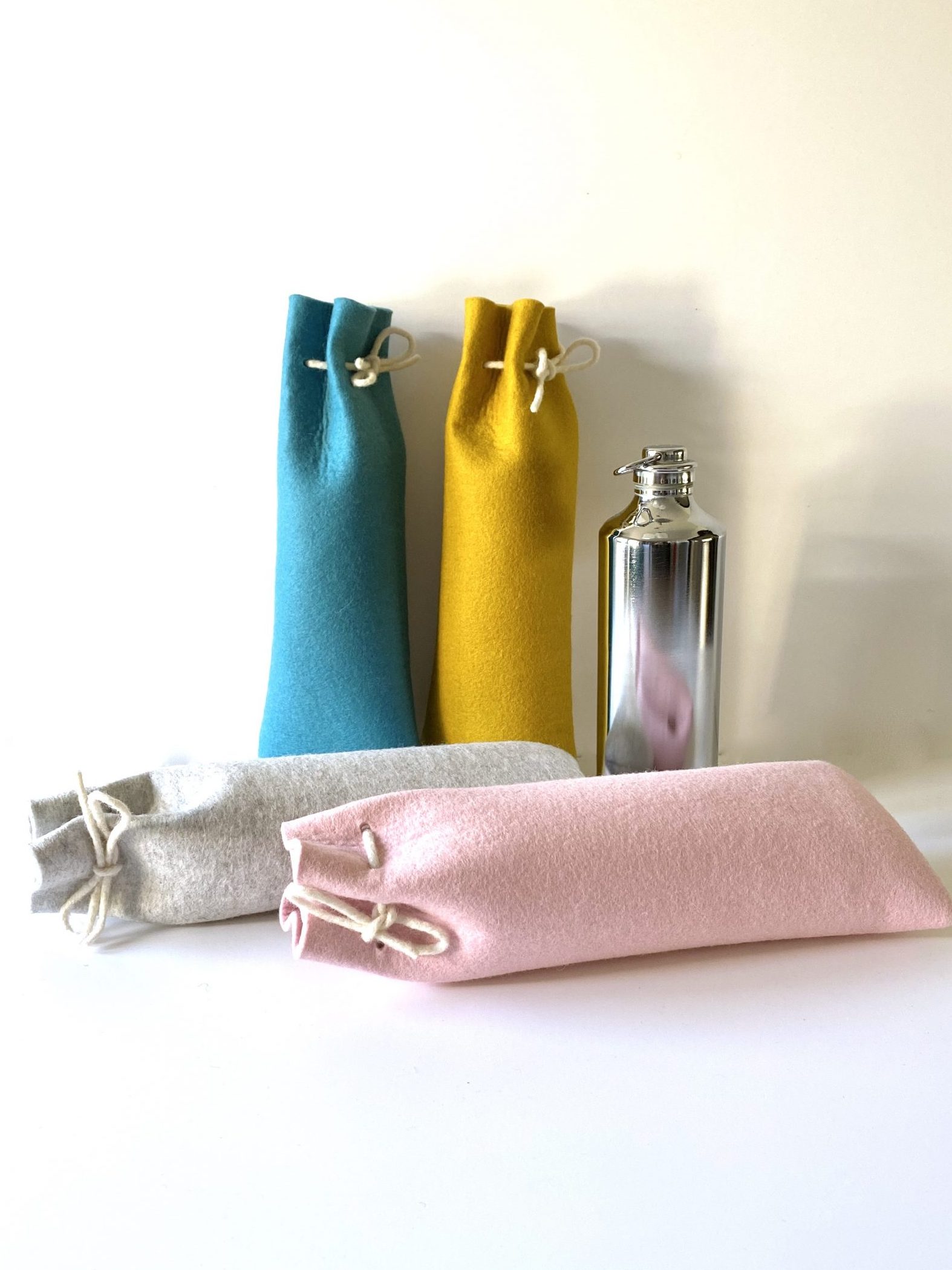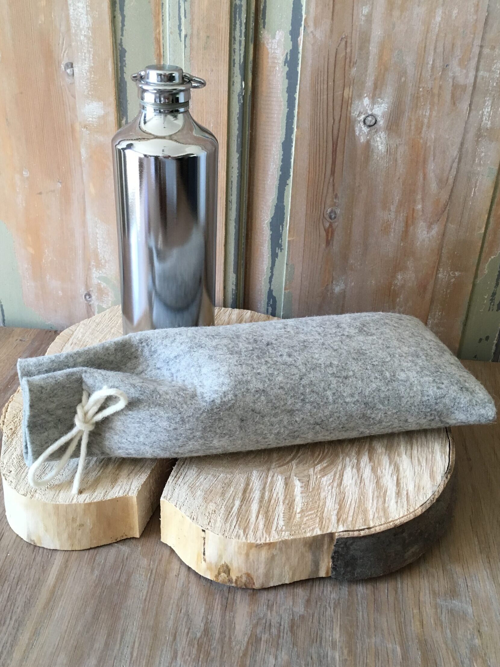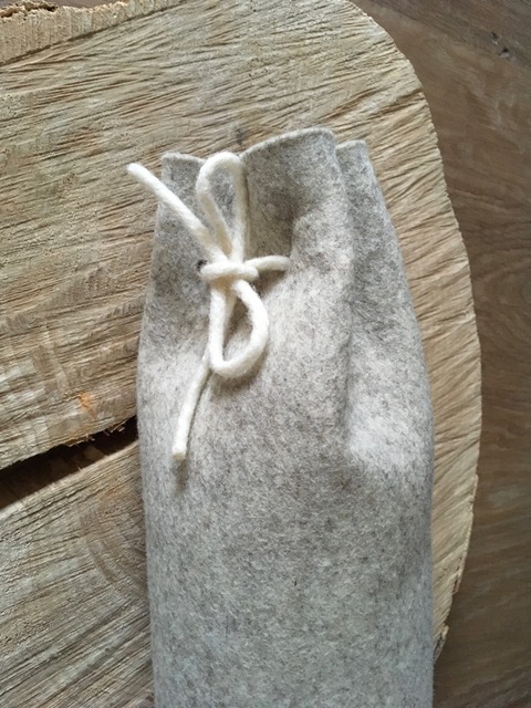 Productinfo: gemaakt van 3 mm dik (100 %) wolvilt. Dicht te knopen met viltkoord. Leverbaar met of zonder de metalen kruik (model kan iets afwijken van getoond model).