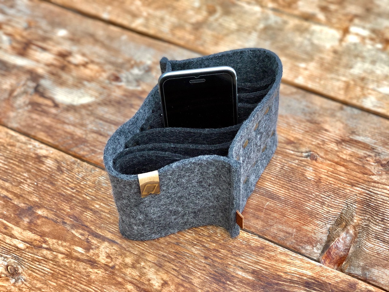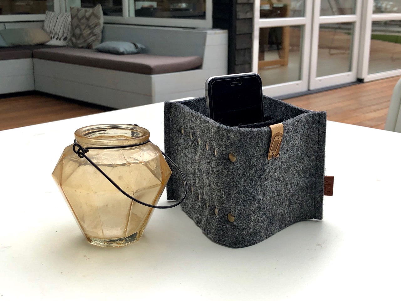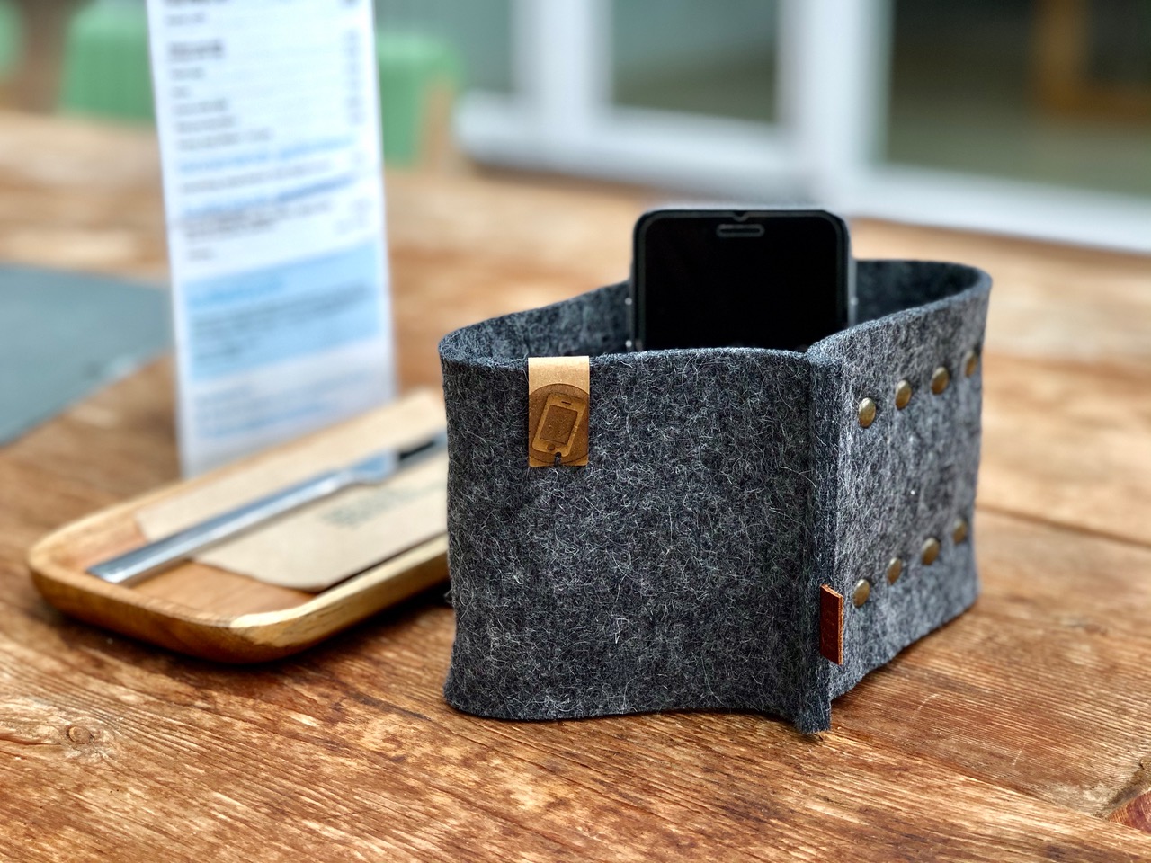 “SOCIALIZEN: daar is de horeca voor! Samenzijn en met elkaar communiceren … of dat nu met een vriend of vriendin is of met een zakelijke relatie. Mensen willen zich samen met iemand terugtrekken. Exclusieve aandacht voor elkaar hebben! Hoe kunt u als horecabedrijf die sfeer uitstralen? De SOCIALIZER helpt u. Het geeft uw gasten een ‘stille hint’: “parkeer je telefoon in deze mooie organiser en geniet van een heerlijk diner of glaasje wijn.” Speciaal voor de horeca ontwikkelde ik deze compacte variant van telefoonorganiser FAMYLJE. Deze telefoonopberger is handgemaakt van 100% wolvilt. Heeft ruimte voor 7 telefoons.”