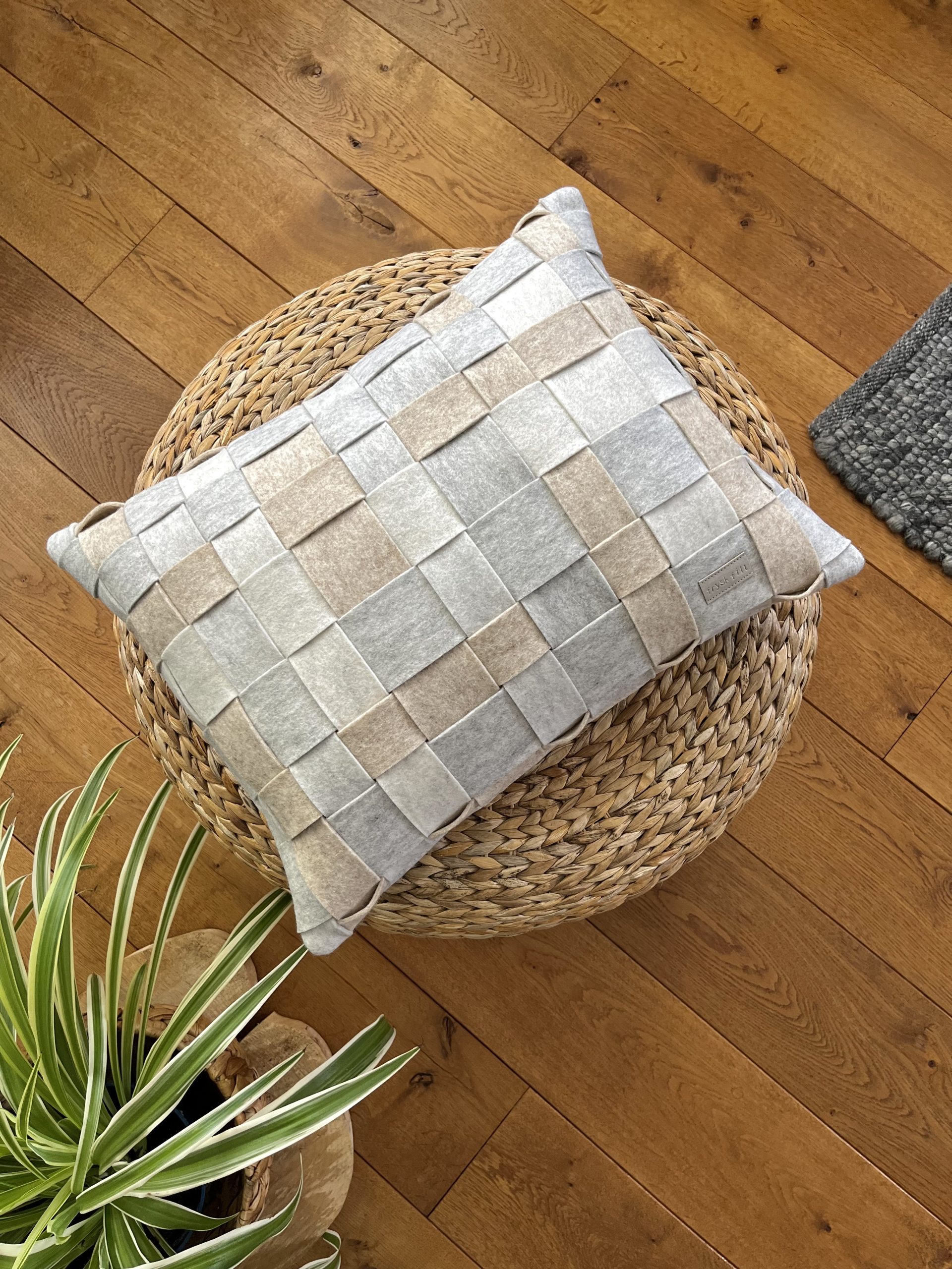 Ben je op zoek naar een uniek en bijzonder kussen? Voor dit ontwerp gebruikte ik stroken in diverse breedtes en kleuren en vlocht ze samen. Achterop zit een rits mooi weggewerkt. Je kunt kiezen uit een synthetisch of biobased vulling.