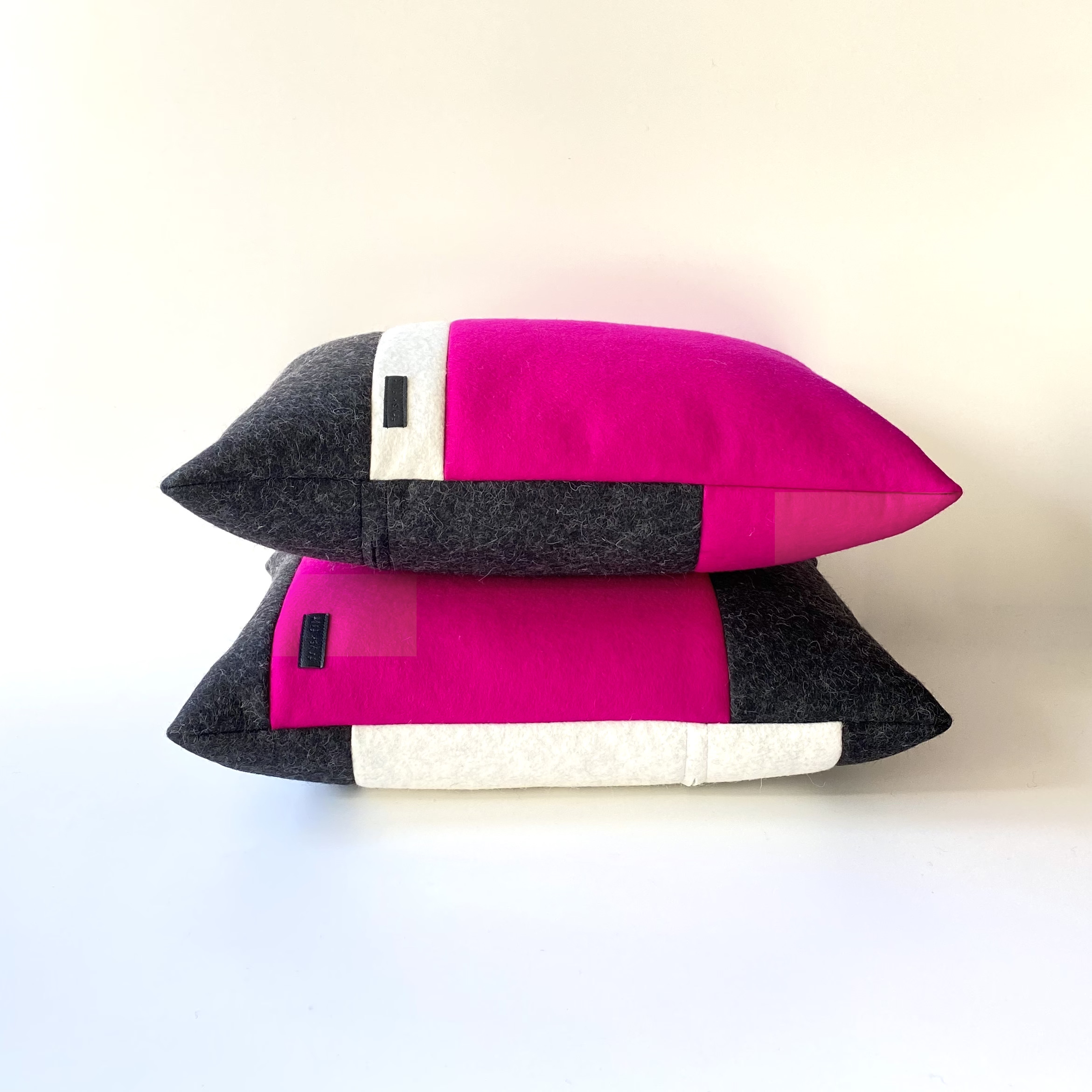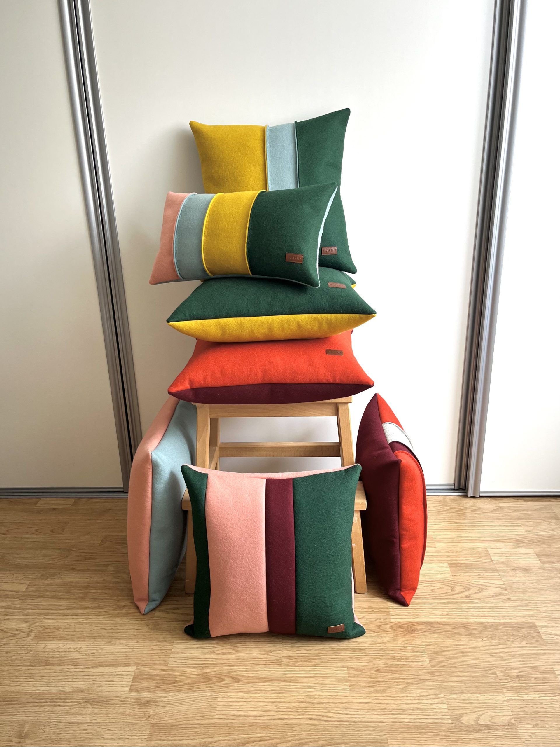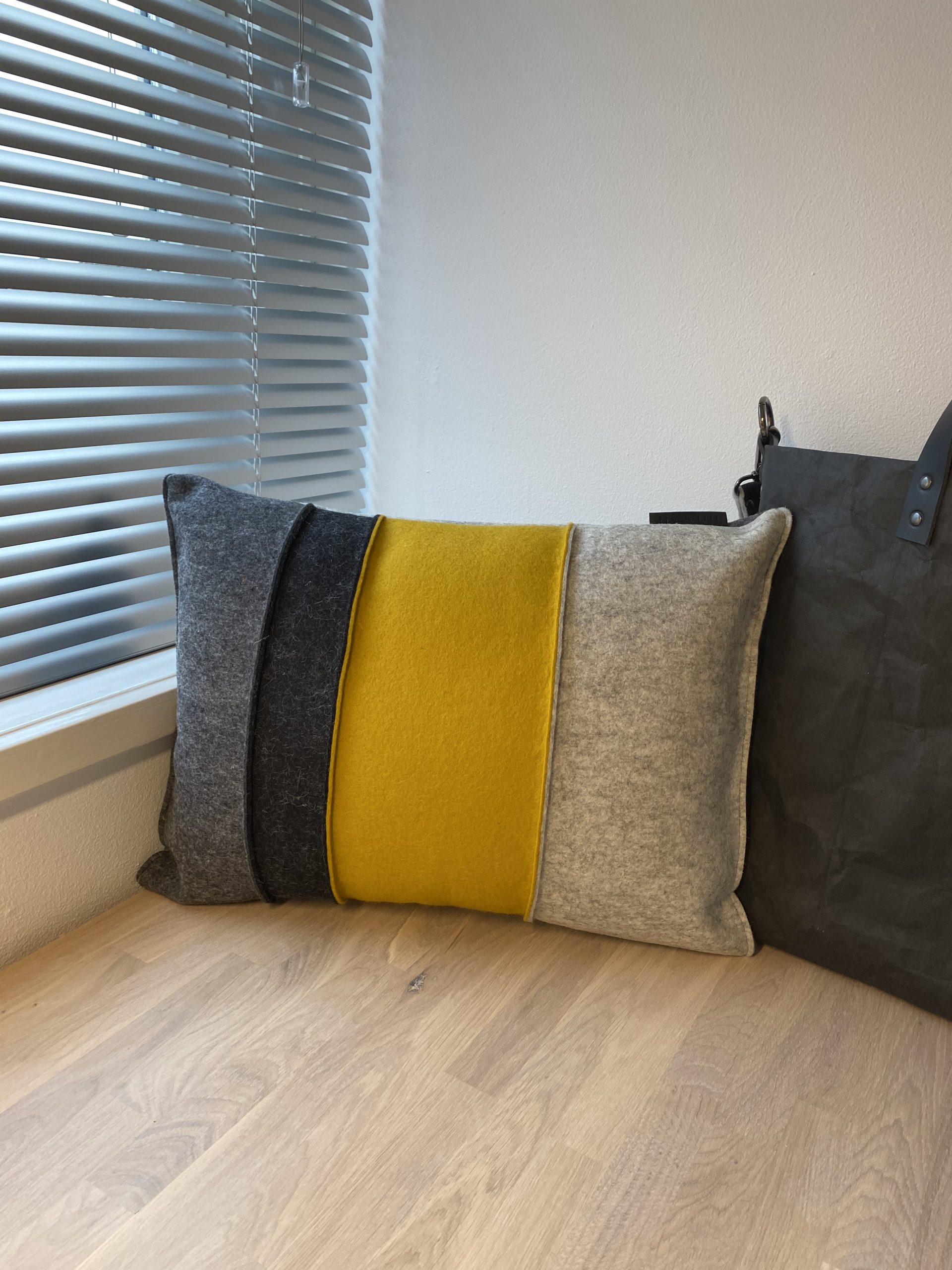 De overtrek maak ik van 100% wolvilt (2 mm dik). Foto 1: kussen naar wens gecombineerd met kussen KONTRAST.