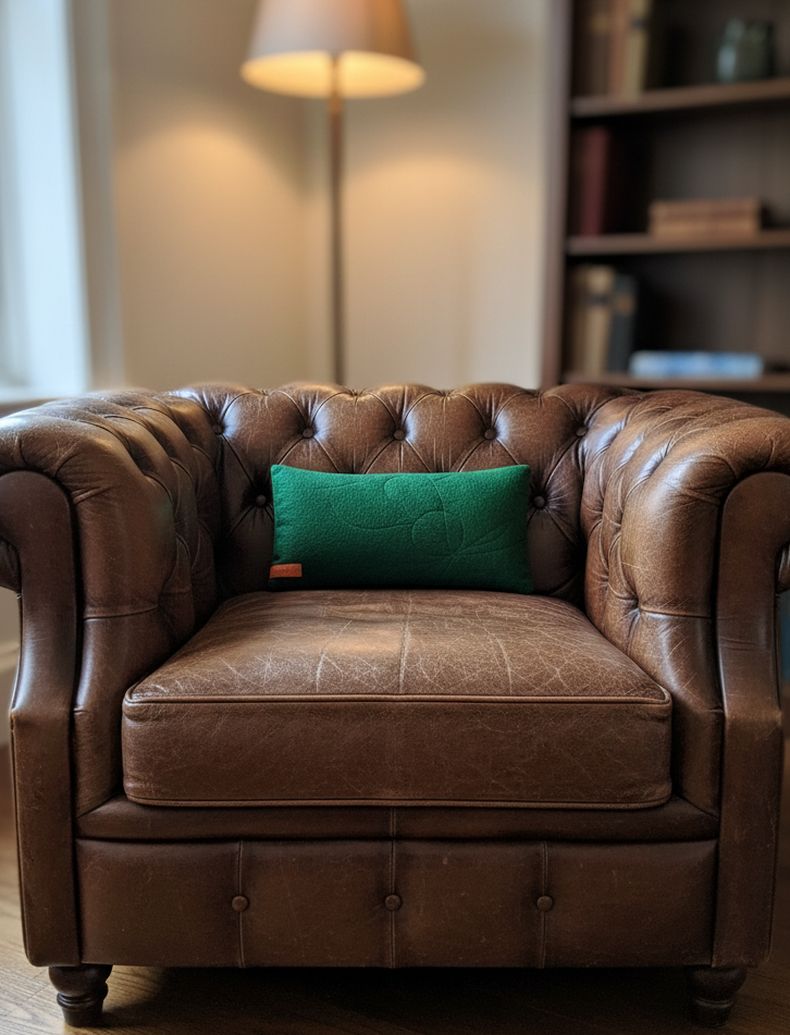“RÊCH: knap lastig als je onder in je rug steeds dat stukje steun mist. Niet alle mooie banken en stoelen bieden je die steun. Vandaar dit kleine en mooie kussentje van 100% wolvilt. “