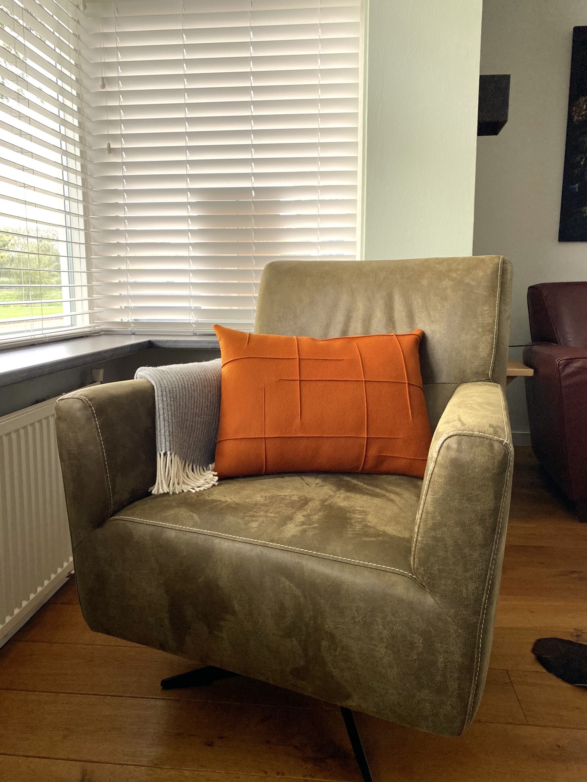 “Oranjerood, roestbruin… de kleur waarin het eerste kussen werd gemaakt! Voor wie van weidevogels houdt, is het ook de kleur van de grutto. Althans van de borst van de mannetjesgrutto. De SKRIES! De roep van de Skries (“grut-to, grut-to”) hier in Friesland, maar vast ook op andere plekken in Nederland, is voor mij echt het bewijs dat het voorjaar in aantocht is!”