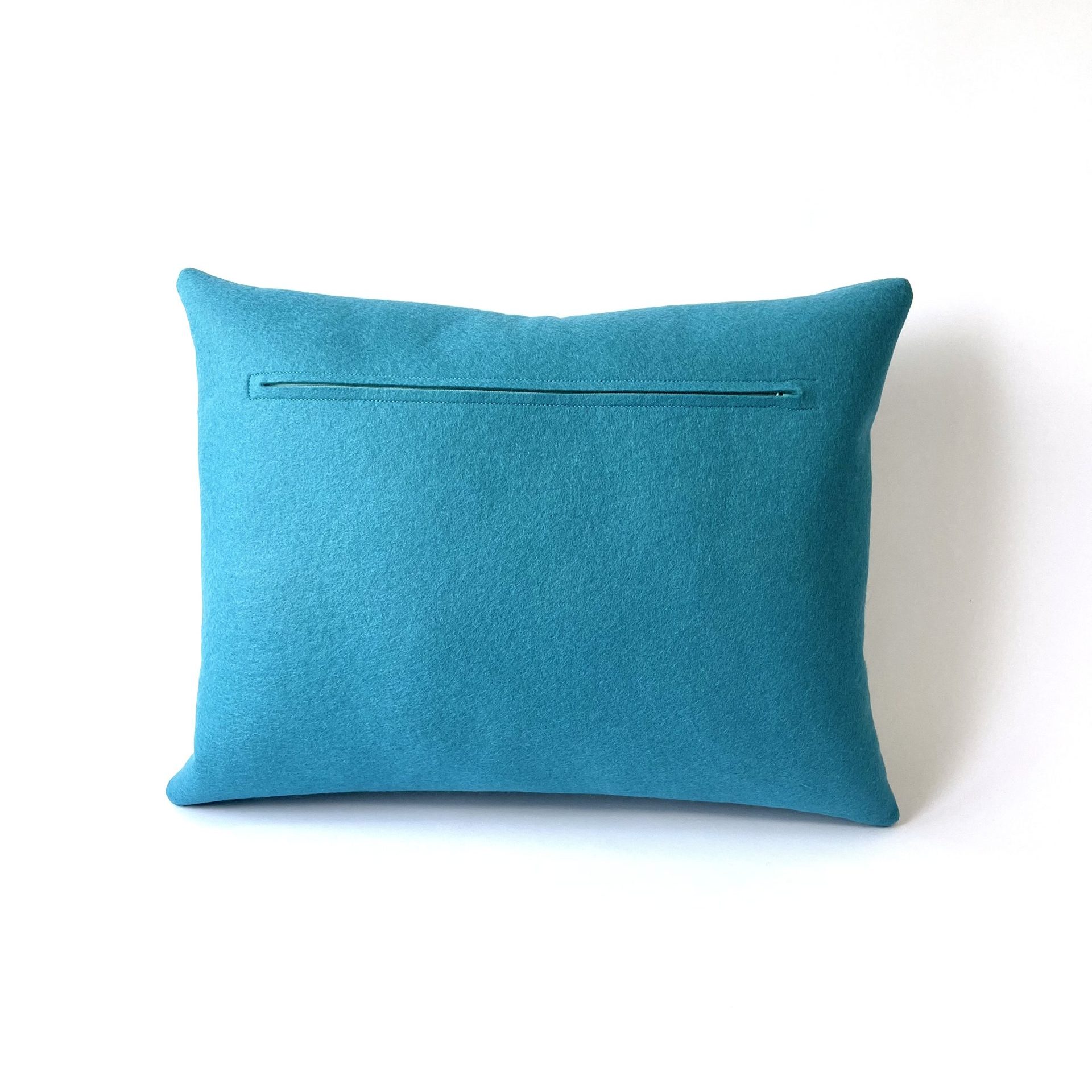 Rechthoekig kussen met kruisende, rechte lijnen. In één kleur, zodat ie makkelijk matcht met je interieur of met andere kussens. Met liefde gemaakt van 100% Wolvilt. Slow Made in 4 uur. Nu in ca 15 kleuren (afgebeeld in kleur aquablauw)!
