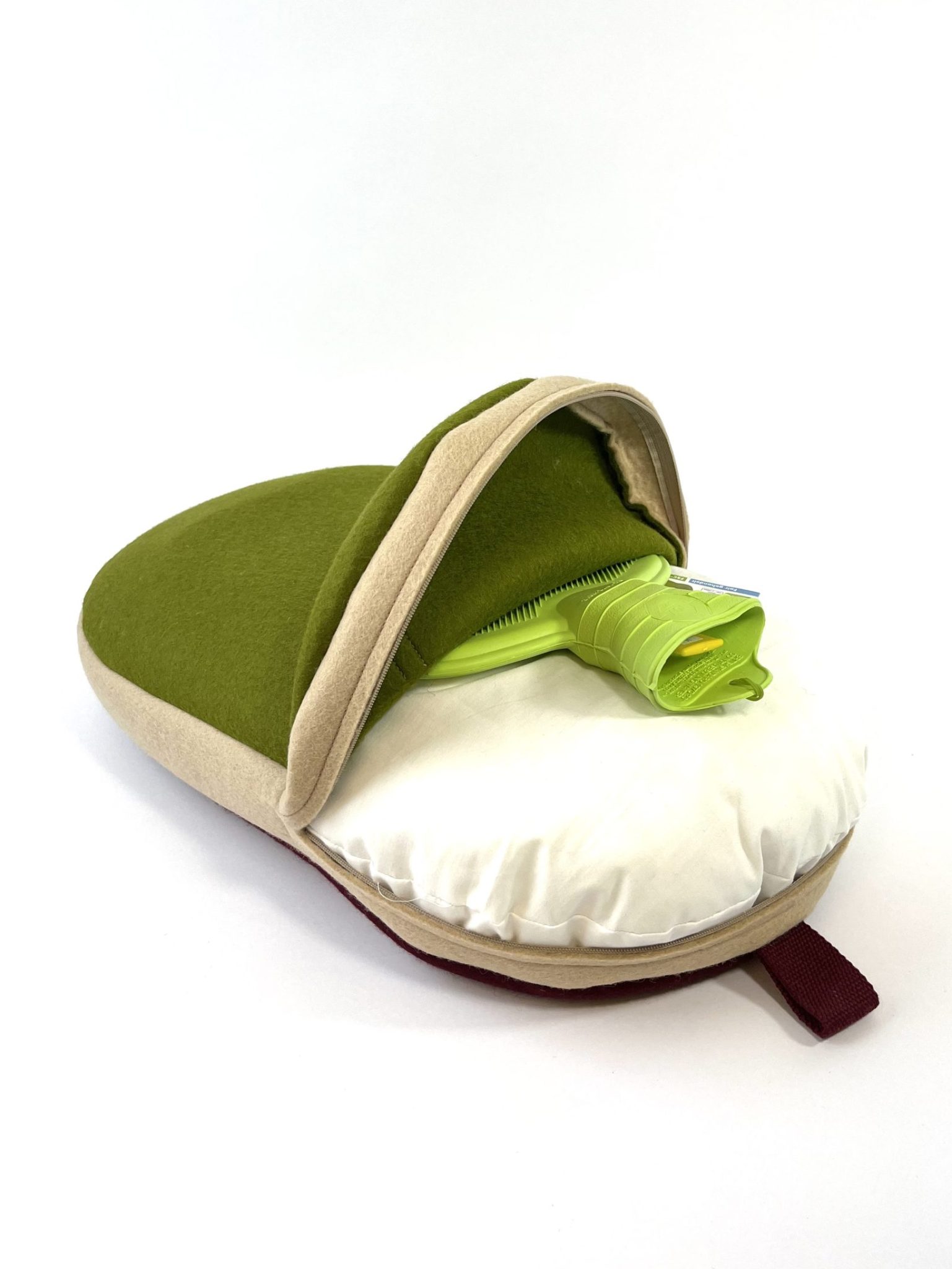 Let’s get back to basic…. vul een warme kruik, stop ‘m in jouw warmtekussen en kruip lekker op de bank of neem m mee naar bed. Heerlijk als rugkussen, of als warme knuffel! Geen snoeren van een e-kussen en alleen de kosten van het koken van water. Slowmade in 5 uur. Kleine oplage. 100% wolvilt.