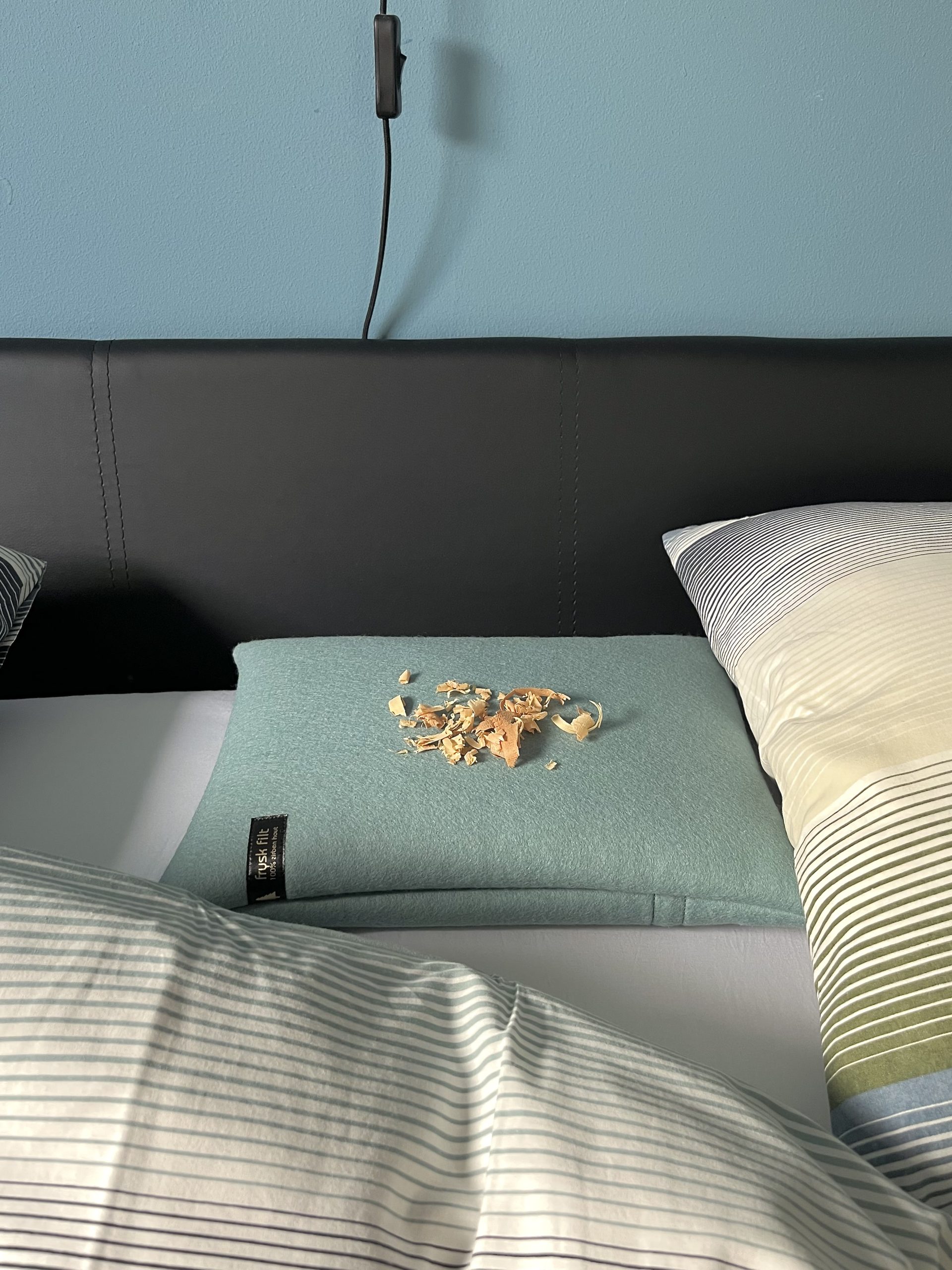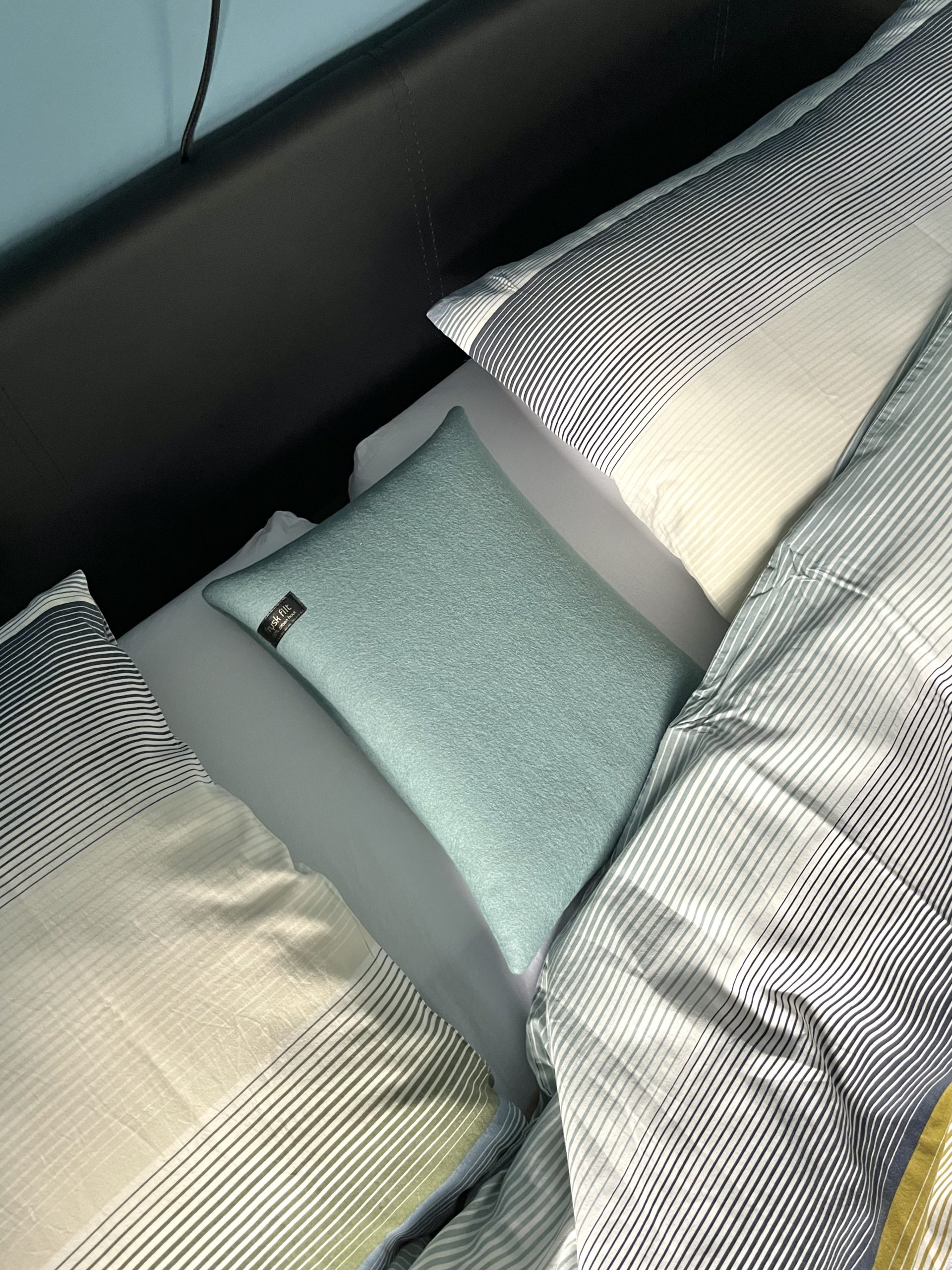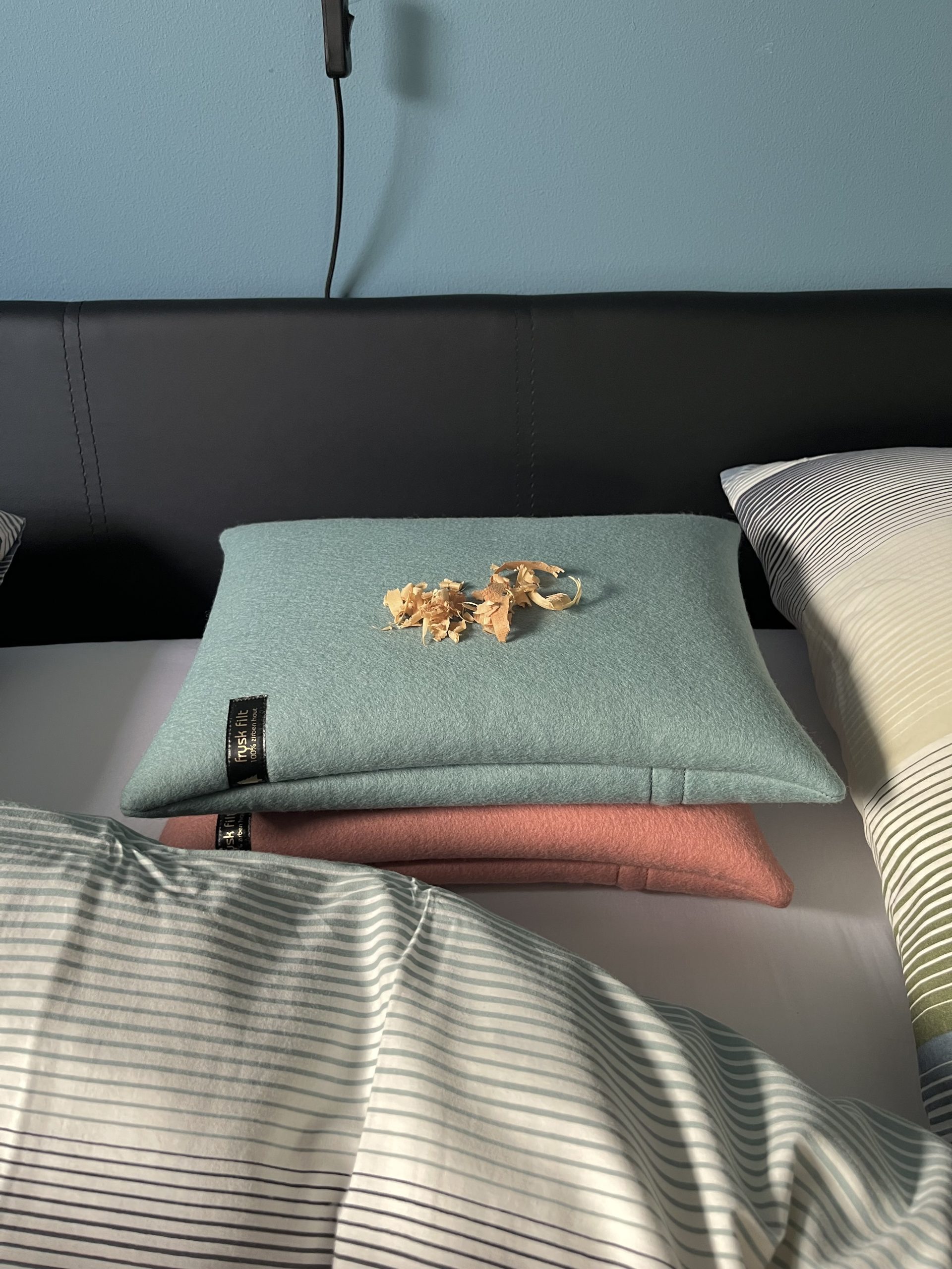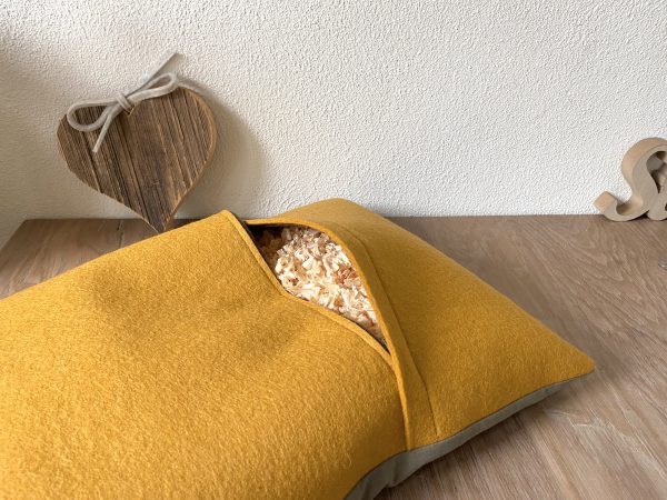 Tip: leg het kussen regelmatig een tijdje in een vochtige ruimte (badkamer, of buiten) om de geur weer wat uit het hout te laten komen.