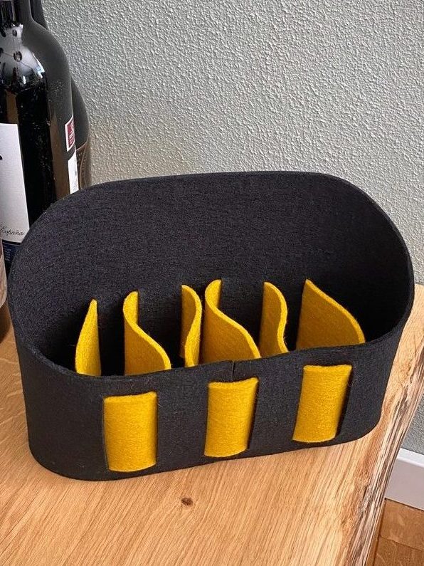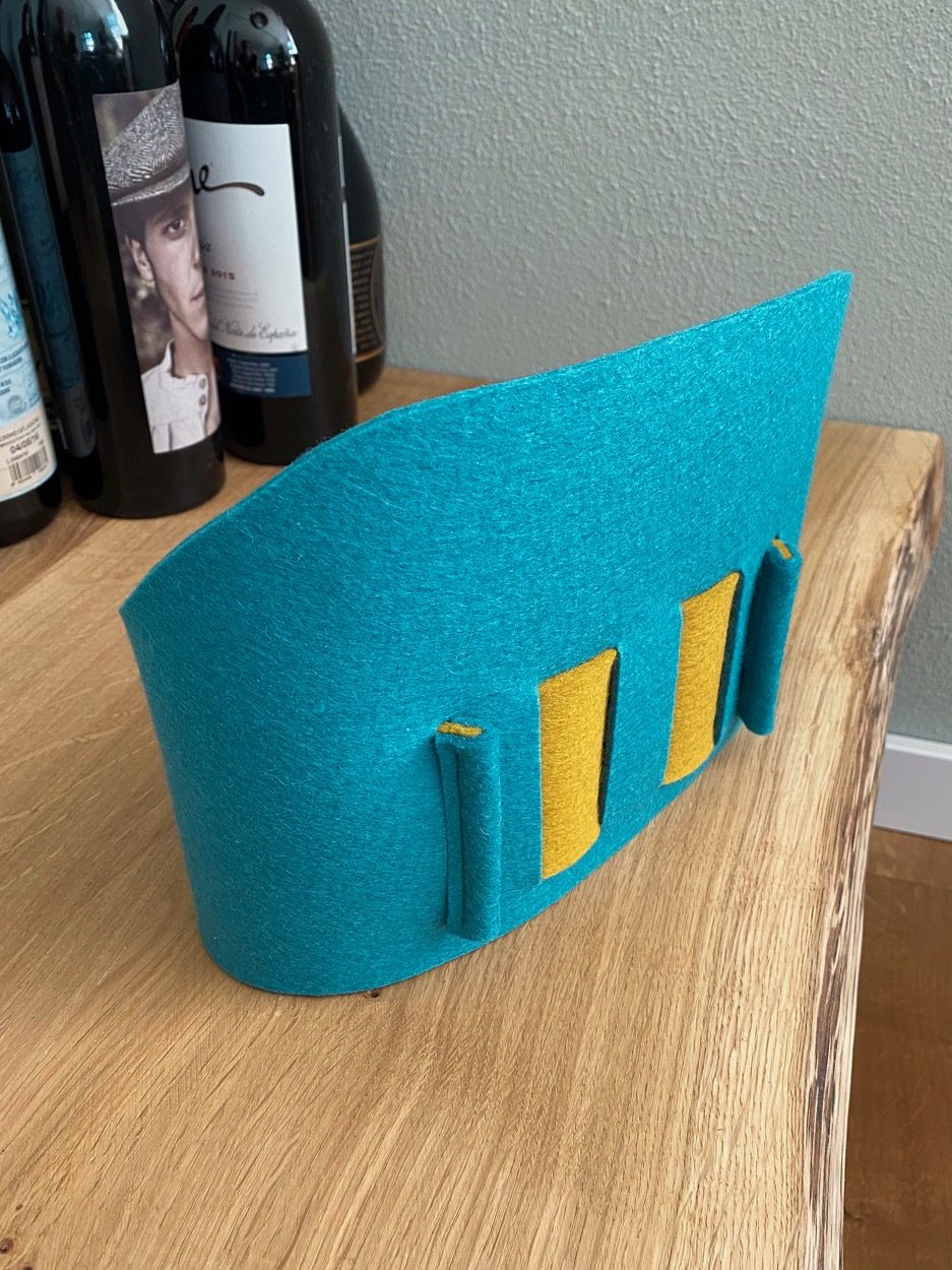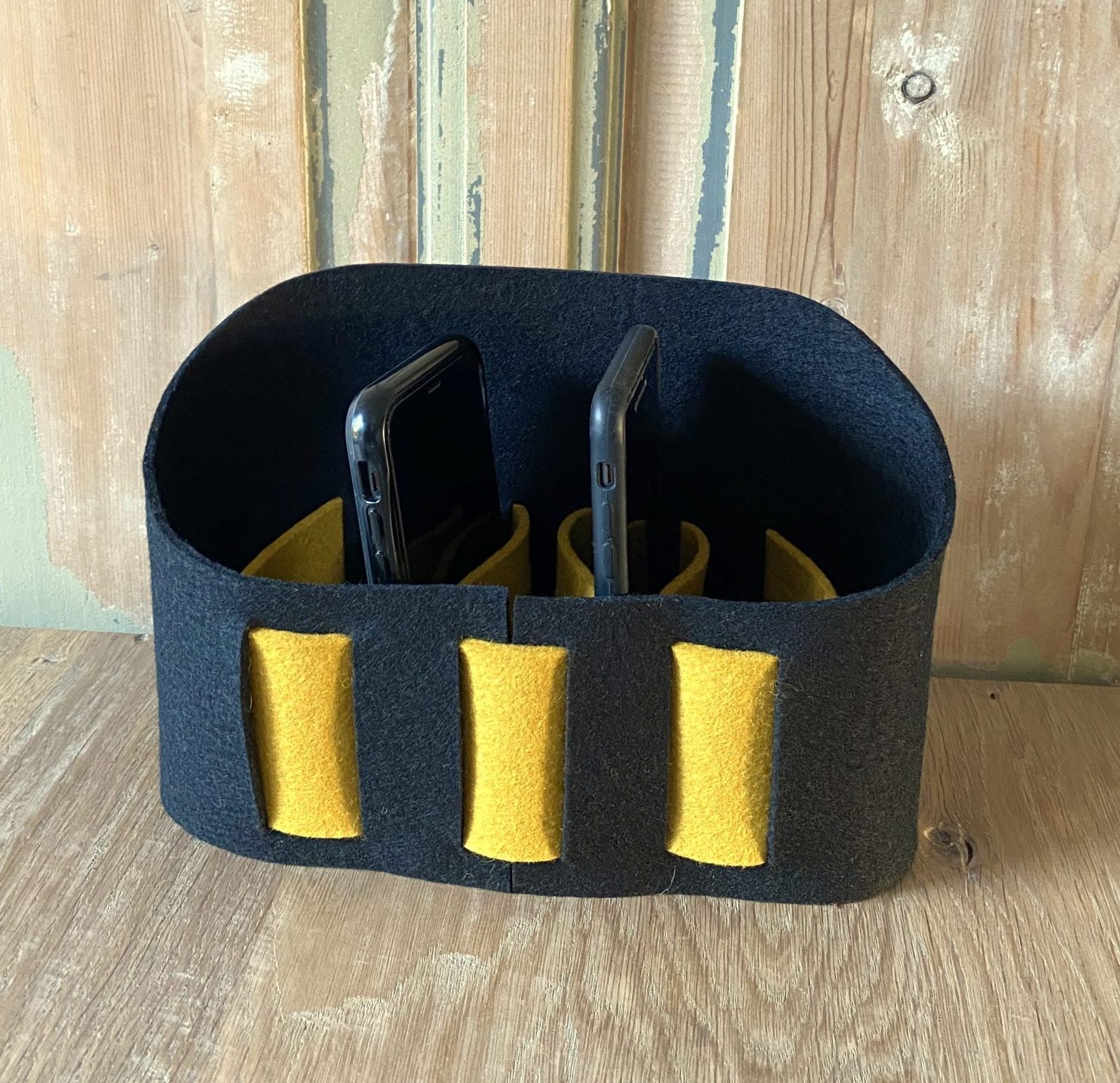 Deze smartphone-organiser biedt ruimte aan ca. 7 telefoons in diverse afmetingen. Let op: de onderkant is open. Deze uitvoering is met veel plezier ontworpen en gemaakt van 100% wolvilt.