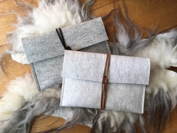 “Skier is een Fries woord voor het mooie waddeneiland Schiermonnikoog (Skiermuontseach), maar eigenlijk dacht ik meer aan een andere betekenis. SKIER staat namelijk ook voor grijze, grauwe lucht. En tja, die hebben we hier in Friesland natuurlijk ook! Kijk liever naar de mooie gemêleerde kleuren wolvilt van deze sleeves. En stop er jouw tablet in!”