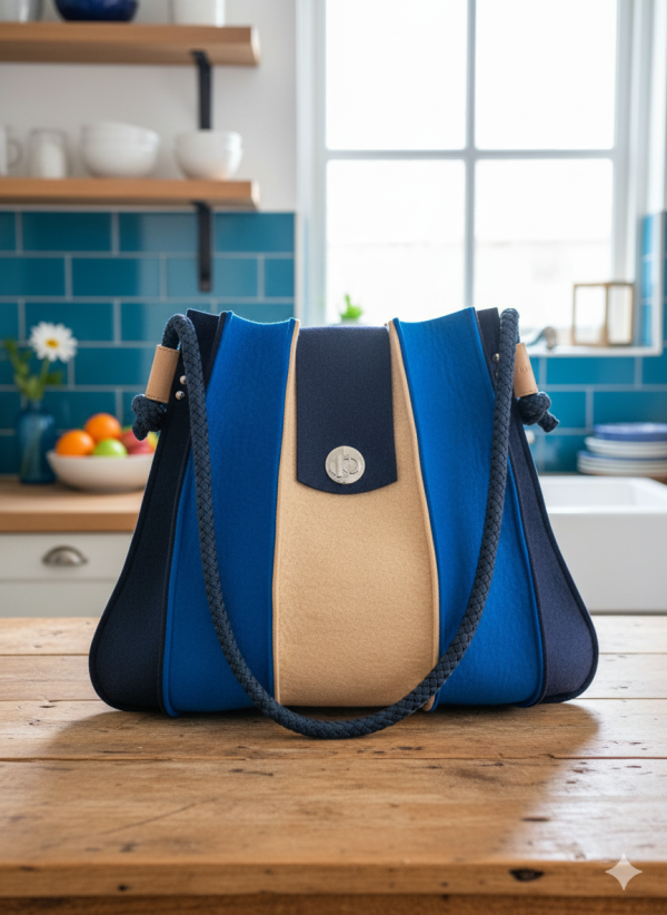 Deze duurzame tas is vervaardigd uit twee tinten blauw en lichtcamel wolvilt. Kies je voor tas FROU dan is dat een bewuste keuze, want dit is geen synthetisch vilt, maar 100% recyclebaar wolvilt. Bovendien is een tas van vilt heerlijk licht van gewicht!