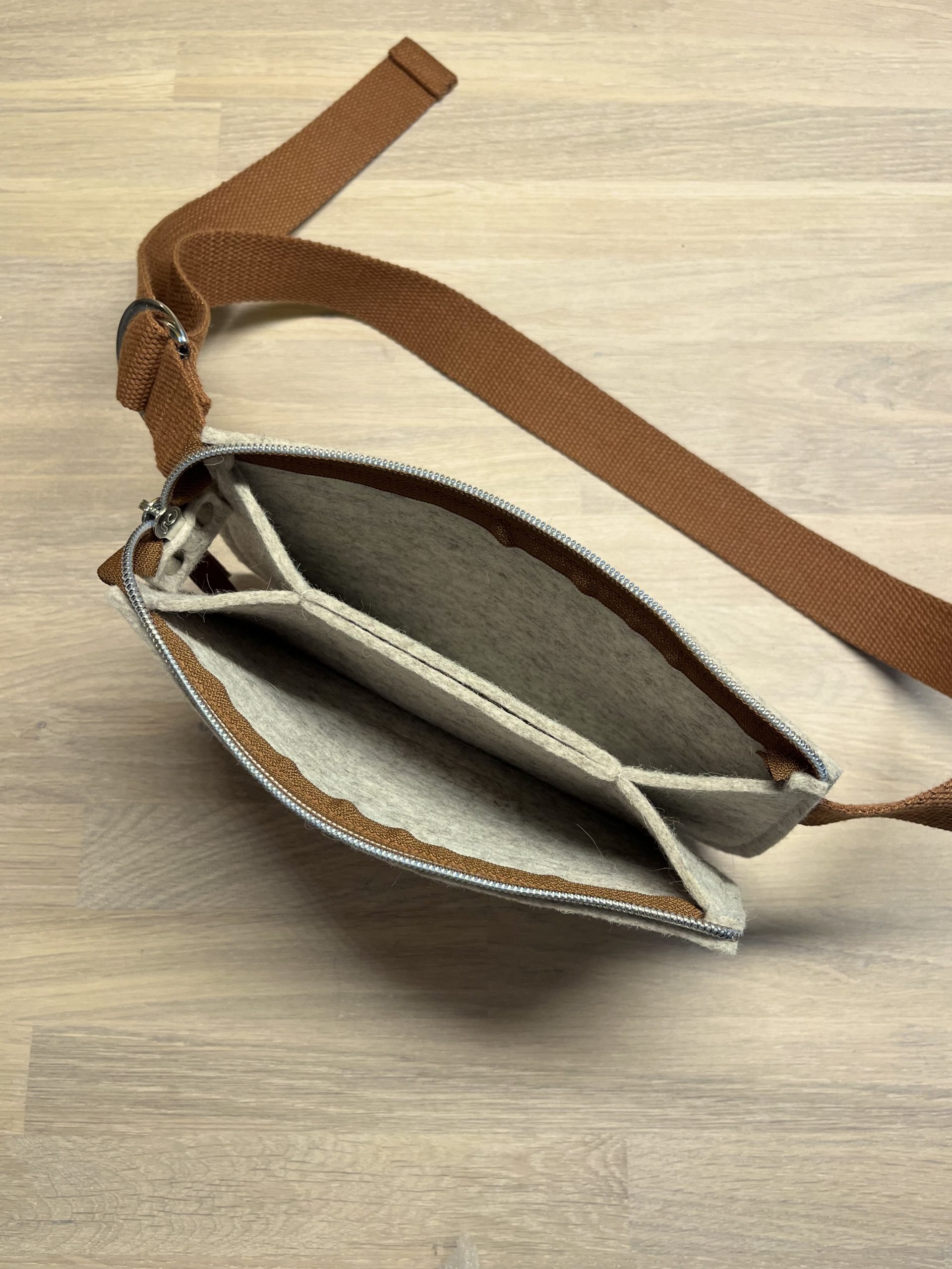 TASKE is gemaakt van 100% wolvilt en heeft twee afsluitbare vakjes en een klein pasjesvakje daartussenin. De band is afgewerkt met een stijlvolle dubbele D-ring, past om diverse tailles en is naar wens losser of vaster aan te snoeren. Het heuptasje is uitgevoerd in zwart wolvilt aan de voor- en achterkant, met wolwit wolvilt aan de binnenzijde.