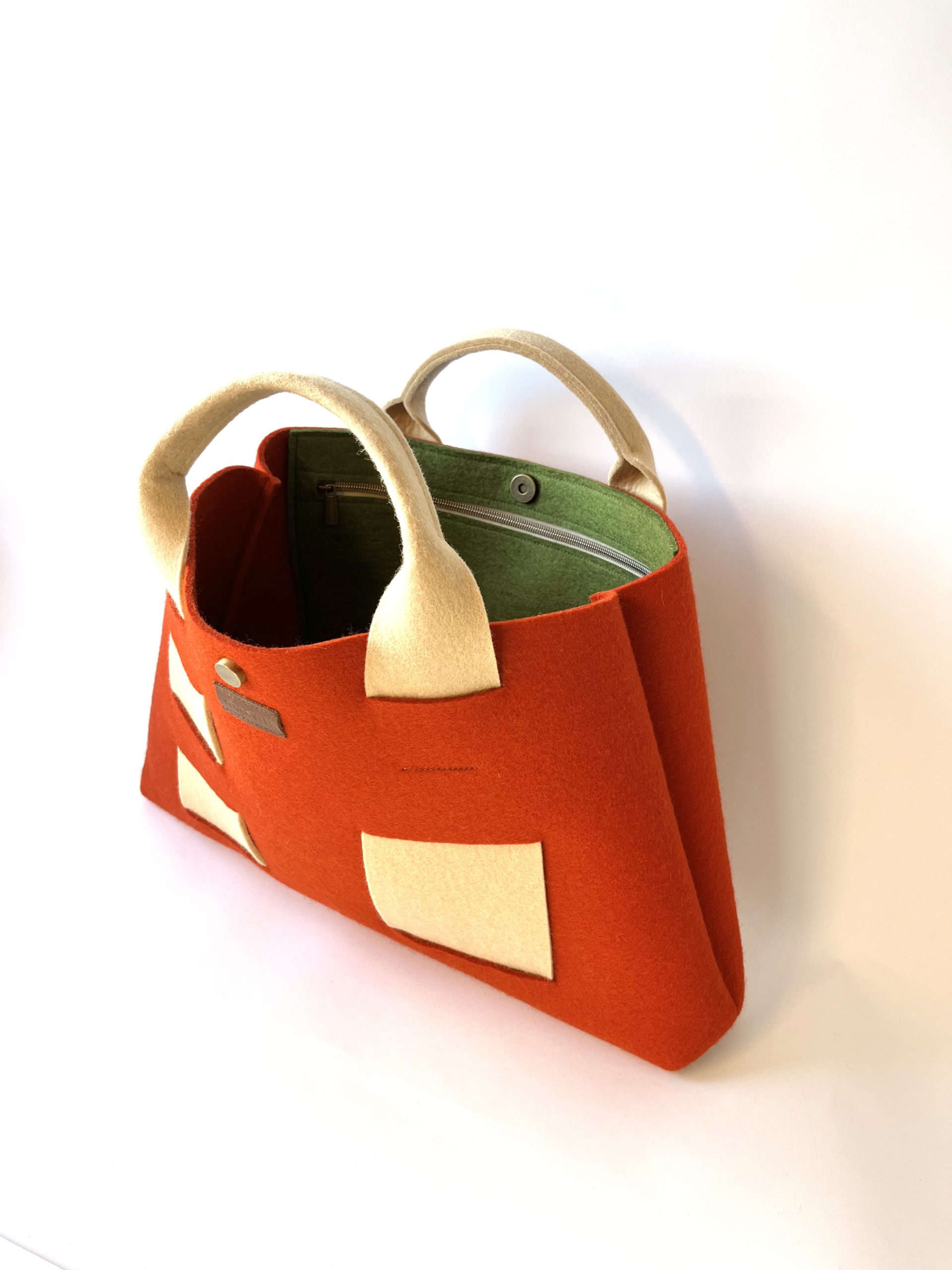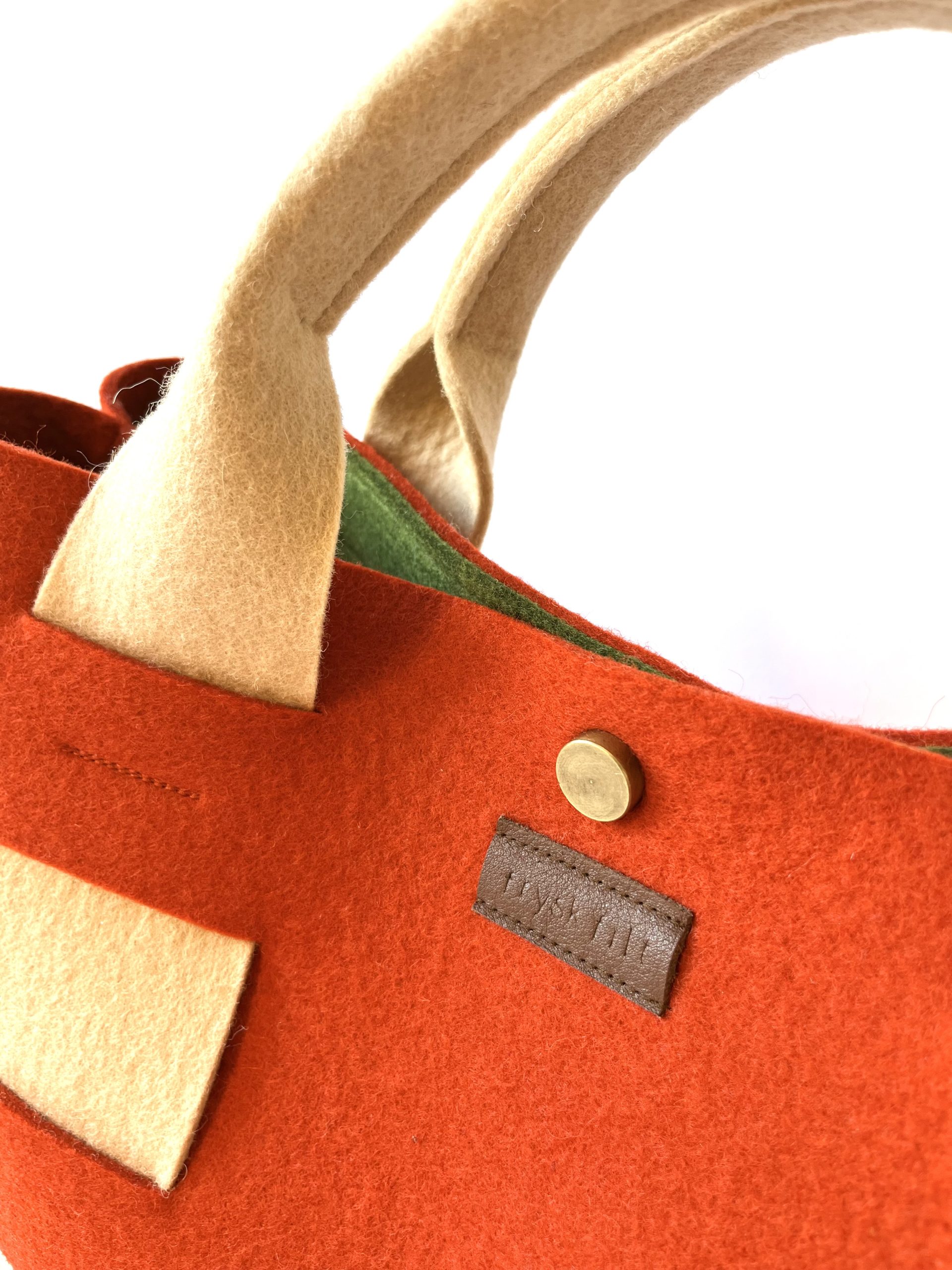 Wat deze tas uniek maakt, is de specifieke combinatie van kleuren: een prachtige steenrode tint, samen met lichtcamel en groen wolvilt. Het maken van deze tas was een zorgvuldig en heerlijk Slow Made-proces van ongeveer 7 uur.