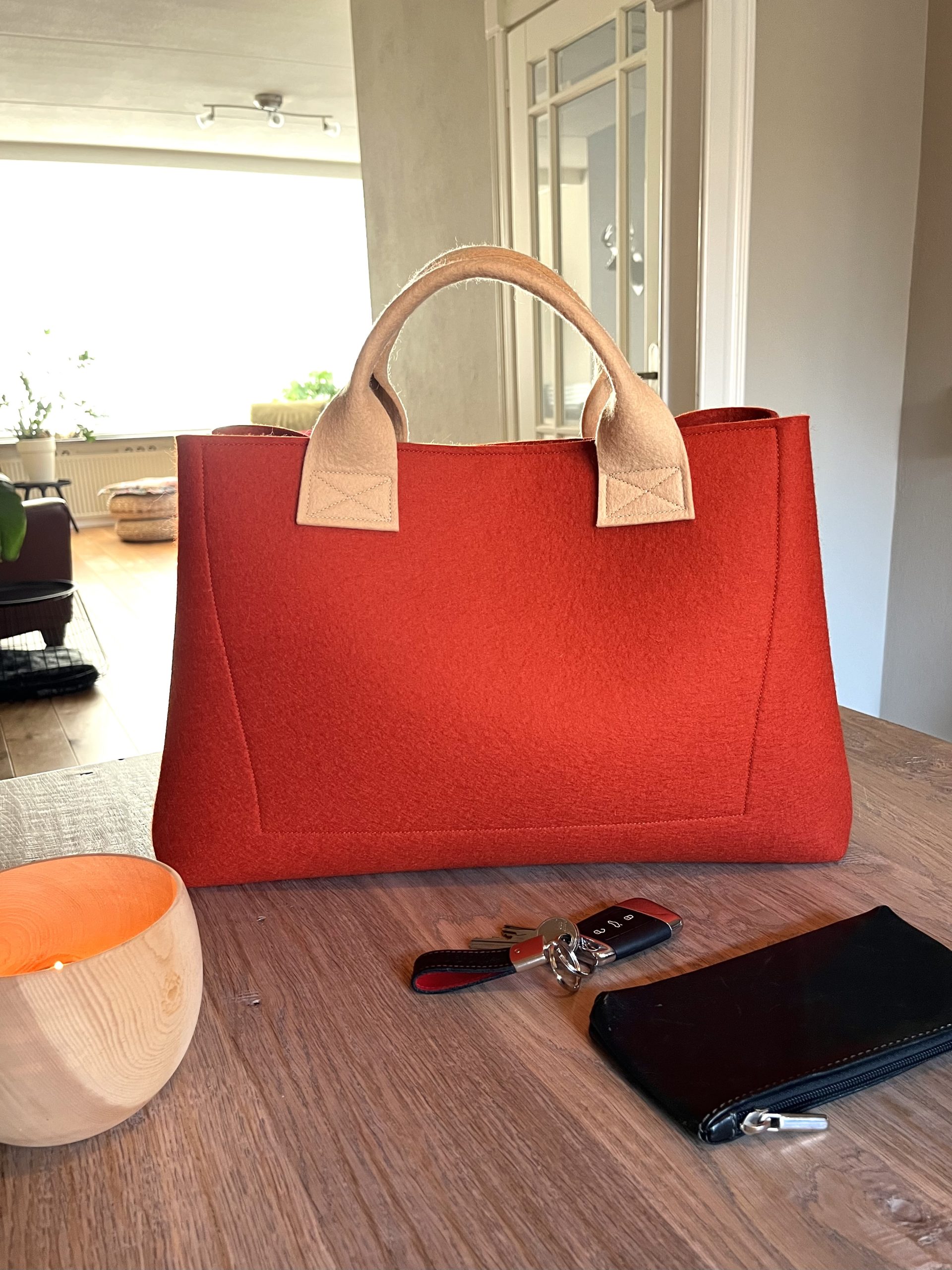 De tas is volledig gemaakt van 3 mm dik, 100% wolvilt. Binnenin vind je één ruim open vak en daarnaast een afsluitbaar vakje voor je kleinere spullen.