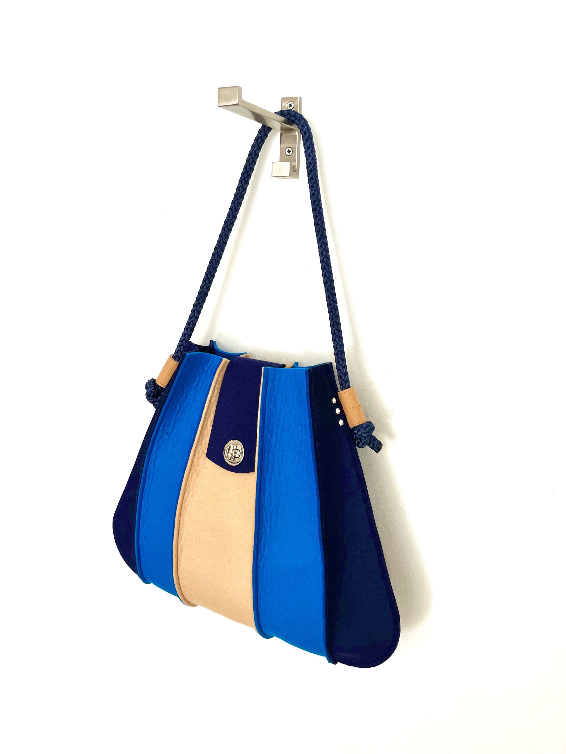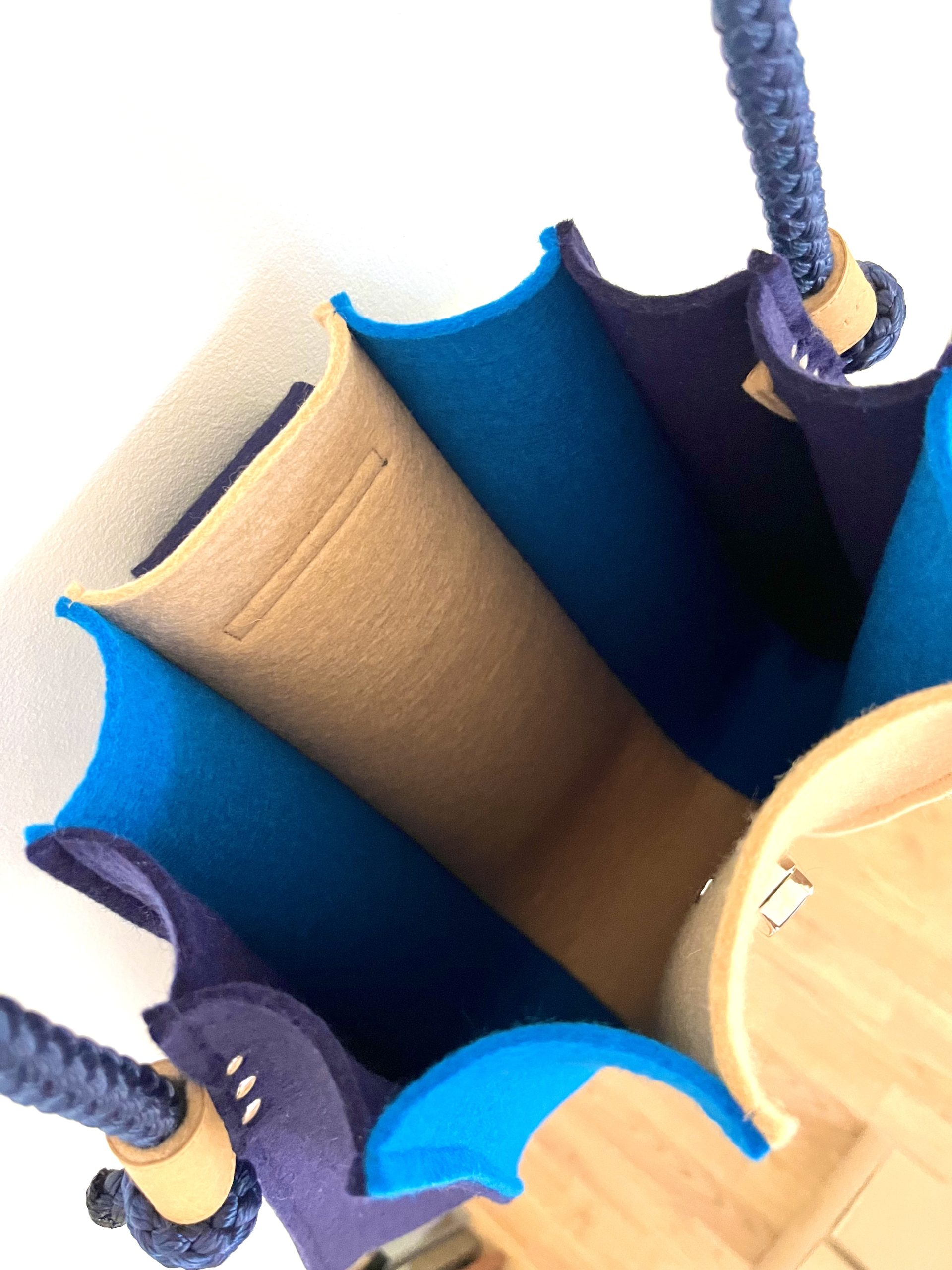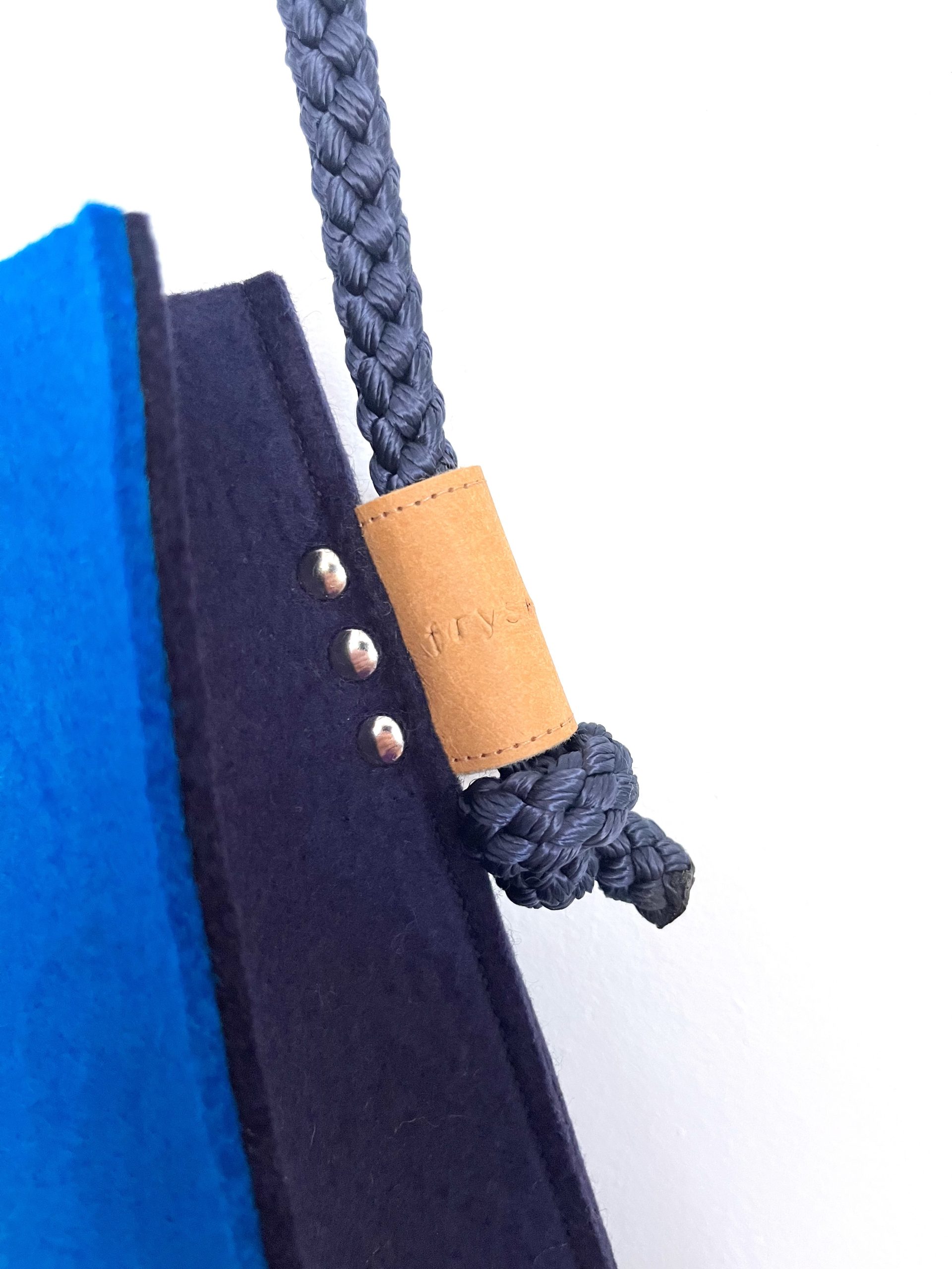Deze duurzame tas is vervaardigd uit twee tinten blauw en lichtcamel wolvilt. Kies je voor tas FROU dan is dat een bewuste keuze, want dit is geen synthetisch vilt, maar 100% recyclebaar wolvilt. Bovendien is een tas van vilt heerlijk licht van gewicht!