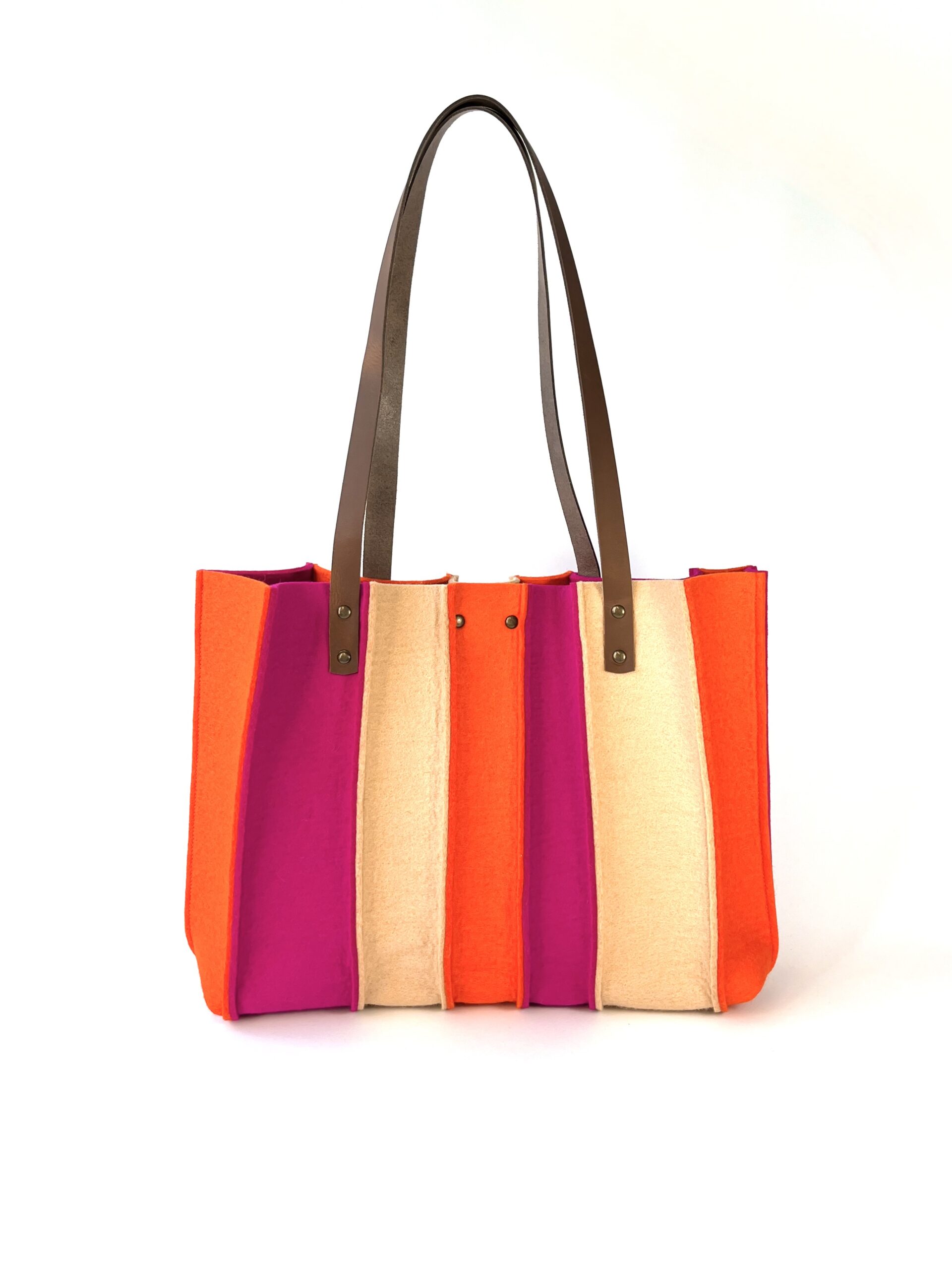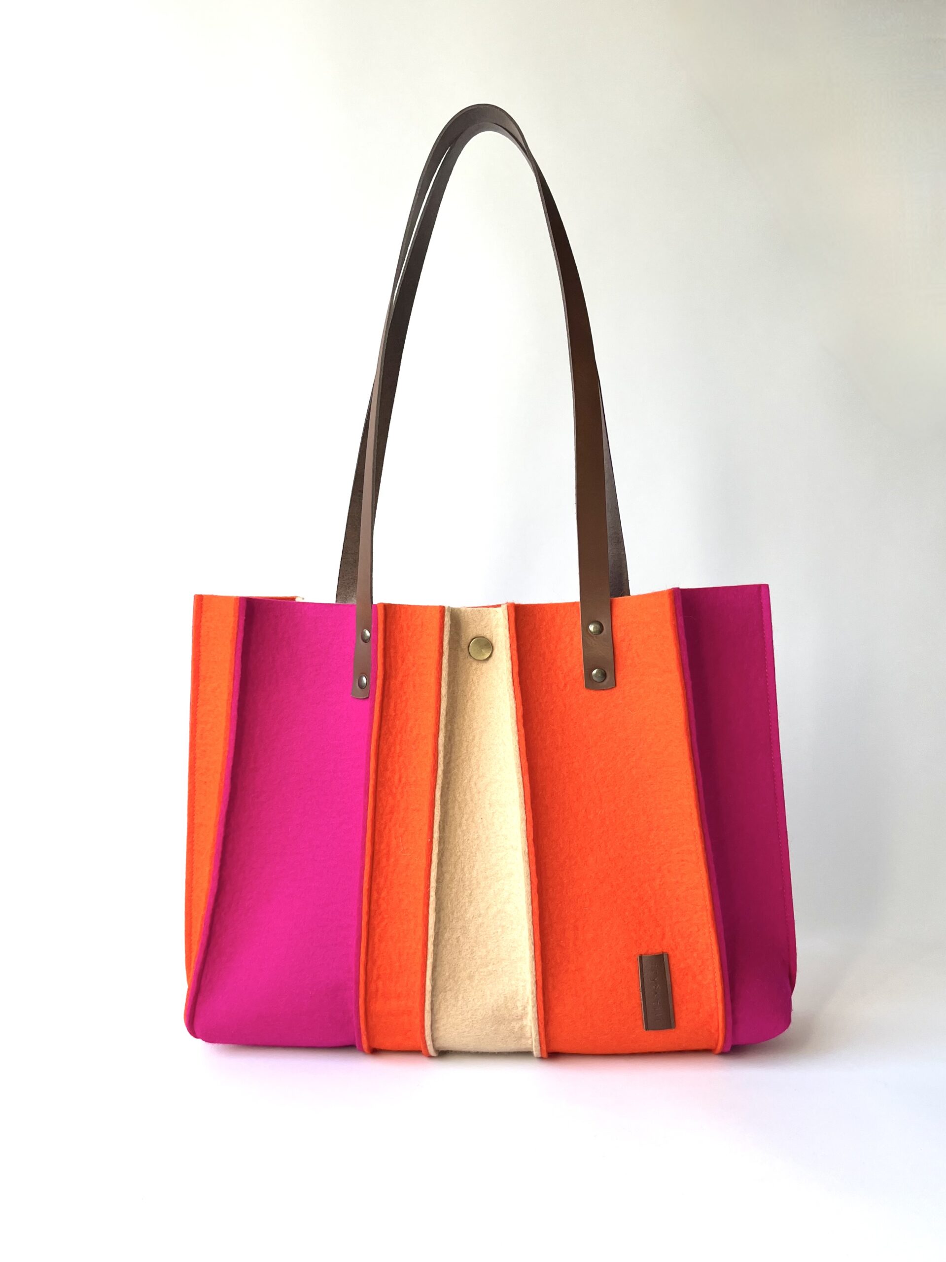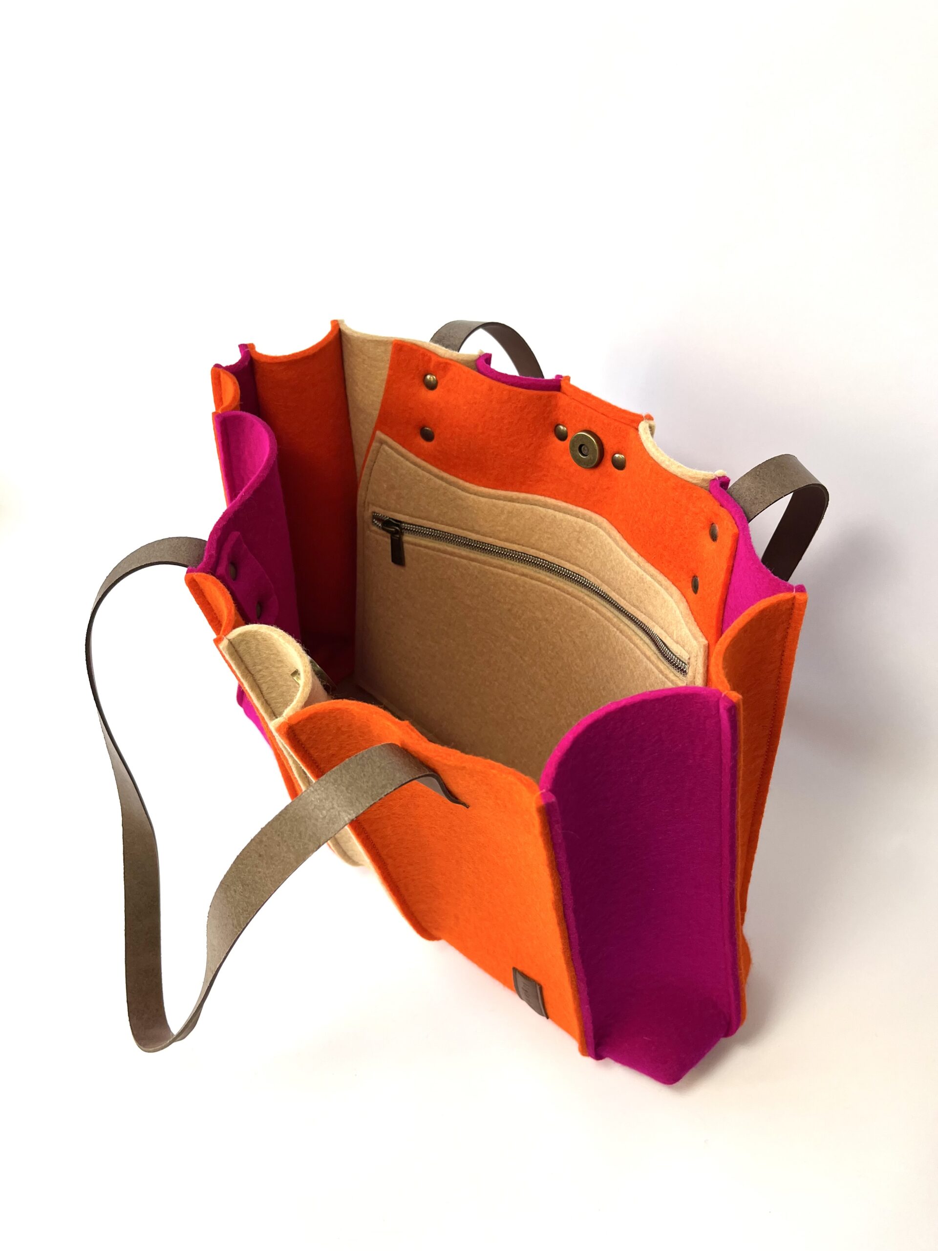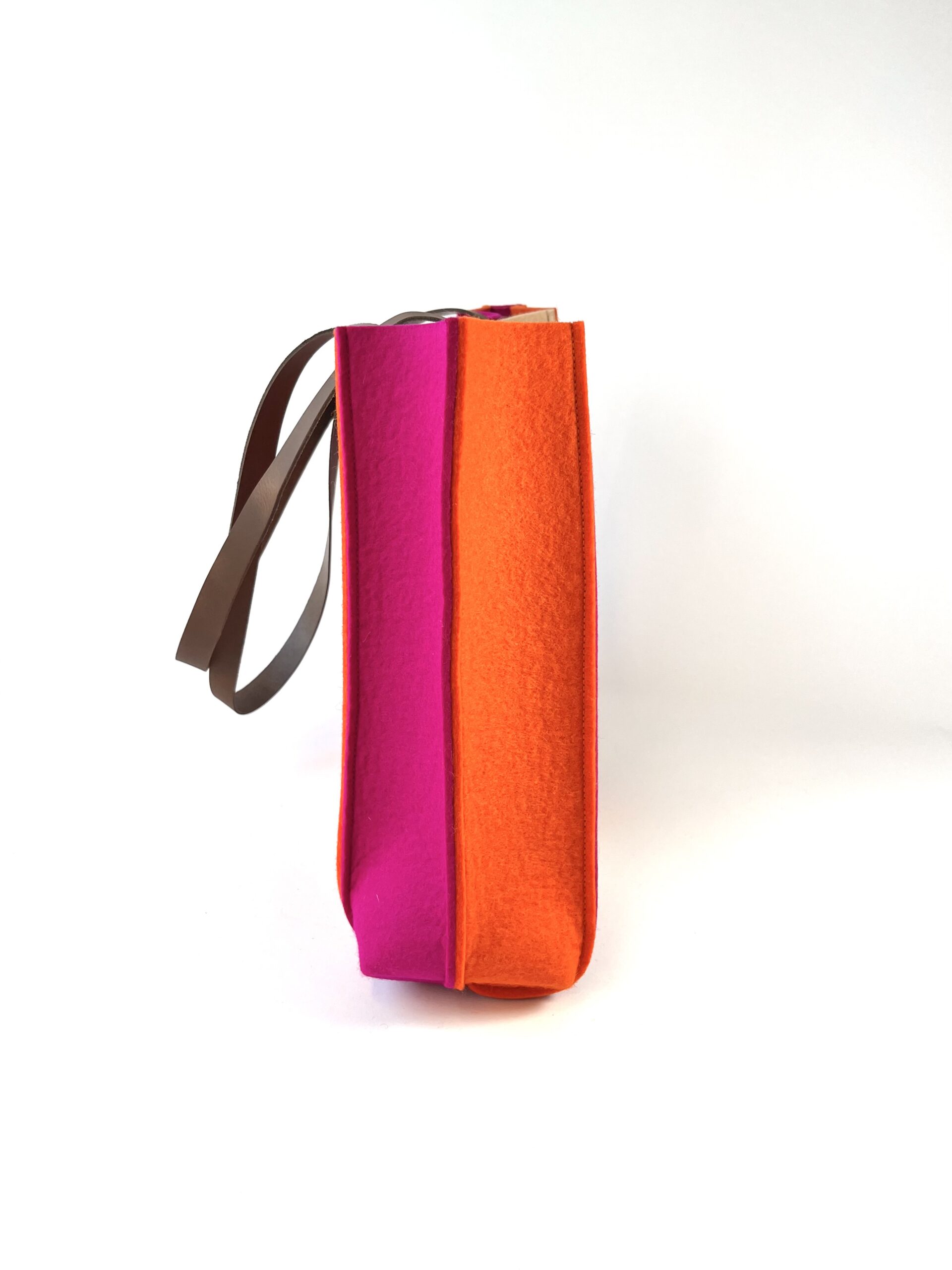 Deze hippe tas is uitgevoerd in een combinatie van vrolijke kleuren: oranje, fuchsiaroze en lichtcamel wolvilt. Hij is met zorg gemaakt, Slow Made in 7 uur… eerlijk en ambachtelijk in Friesland.
