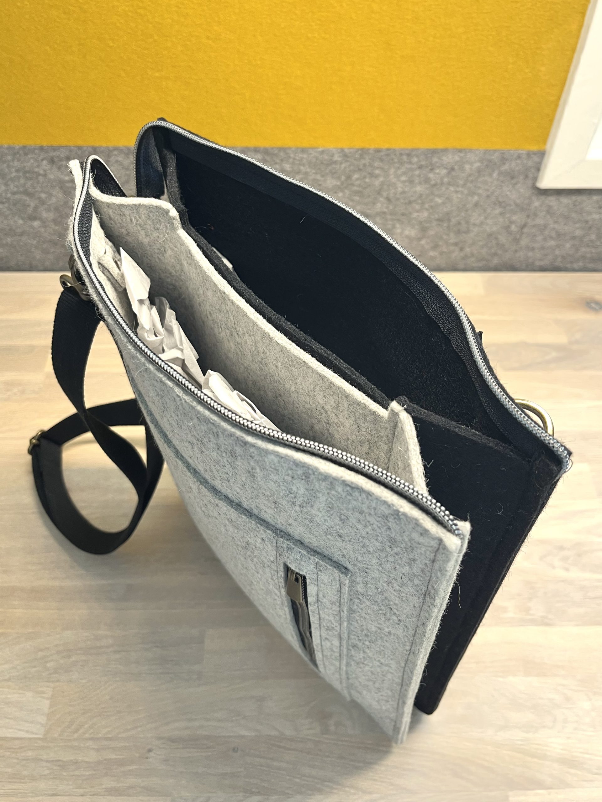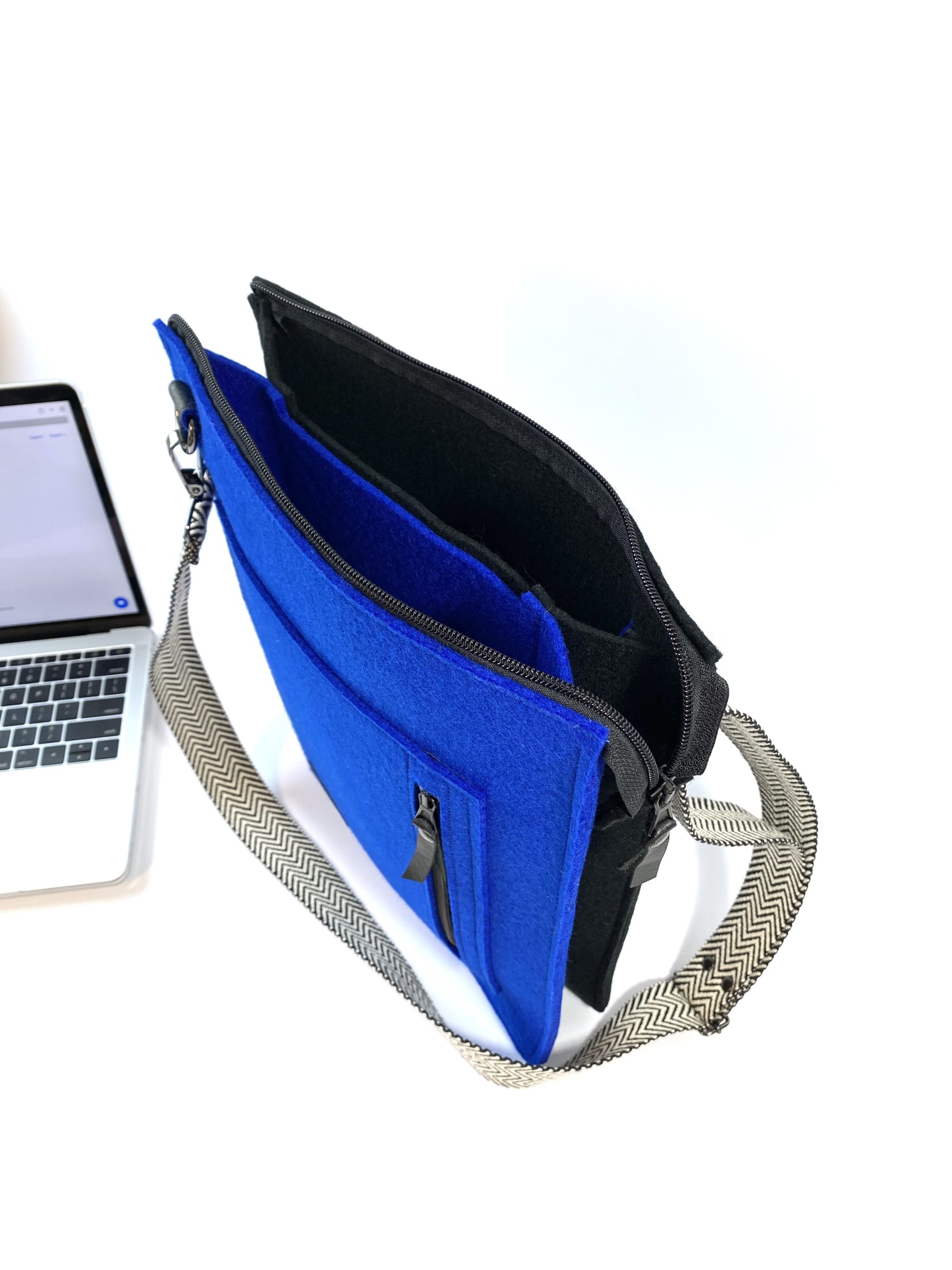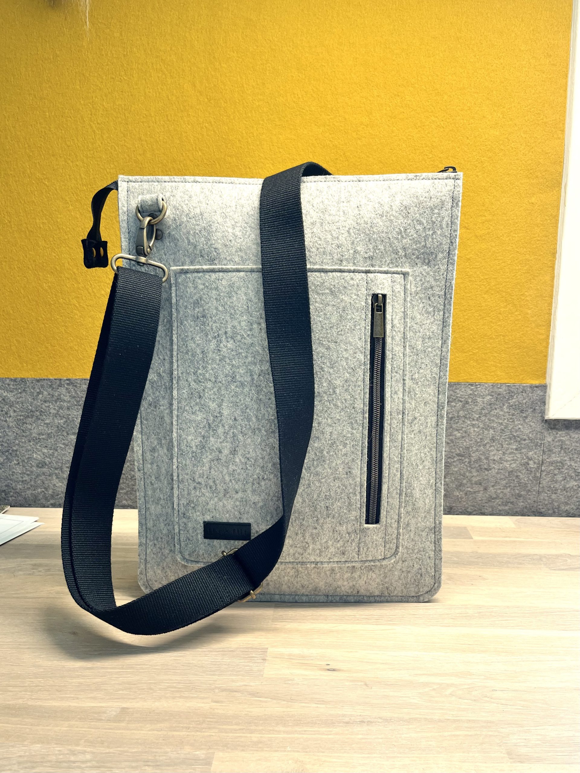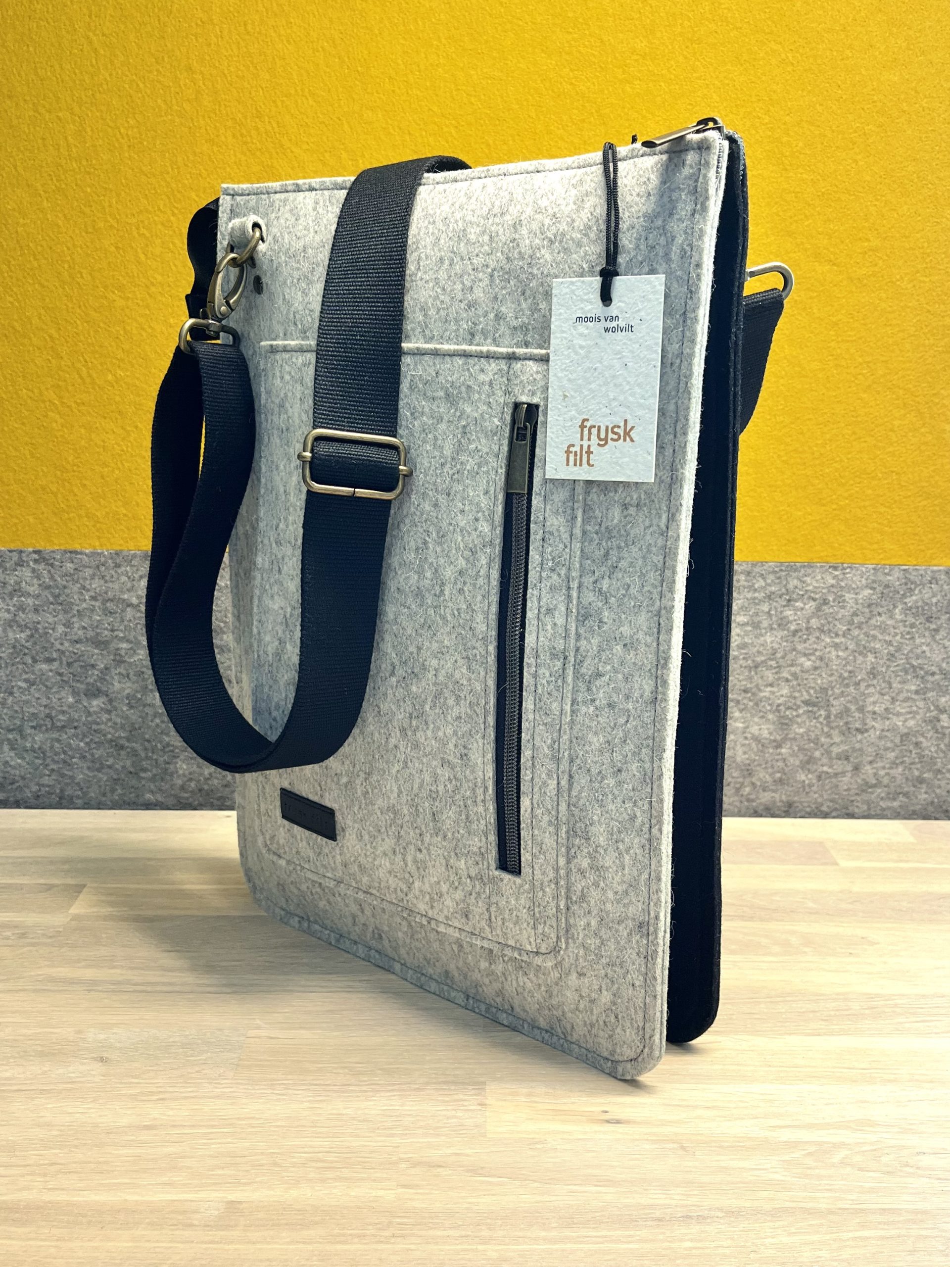 Deze lichte laptoptas cq. schoudertas is gemaakt van 100% wolvilt. De tas bestaat uit 2 grote hoofdvakken en een kleiner (telefoon)vak er tussenin en een afsluitbaar vakje voorop de tas. Voor al je belangrijke zaken zoals telefoon, portemonnee, sleutels enz. De verstelbare schouderband is lekker lang zodat je hem desgewenst schuin over je schouder kunt dragen. Met plezier & aandacht aan gewerkt! Slow Made in 7 uur. 100% wolvilt = 100% recyclebaar!