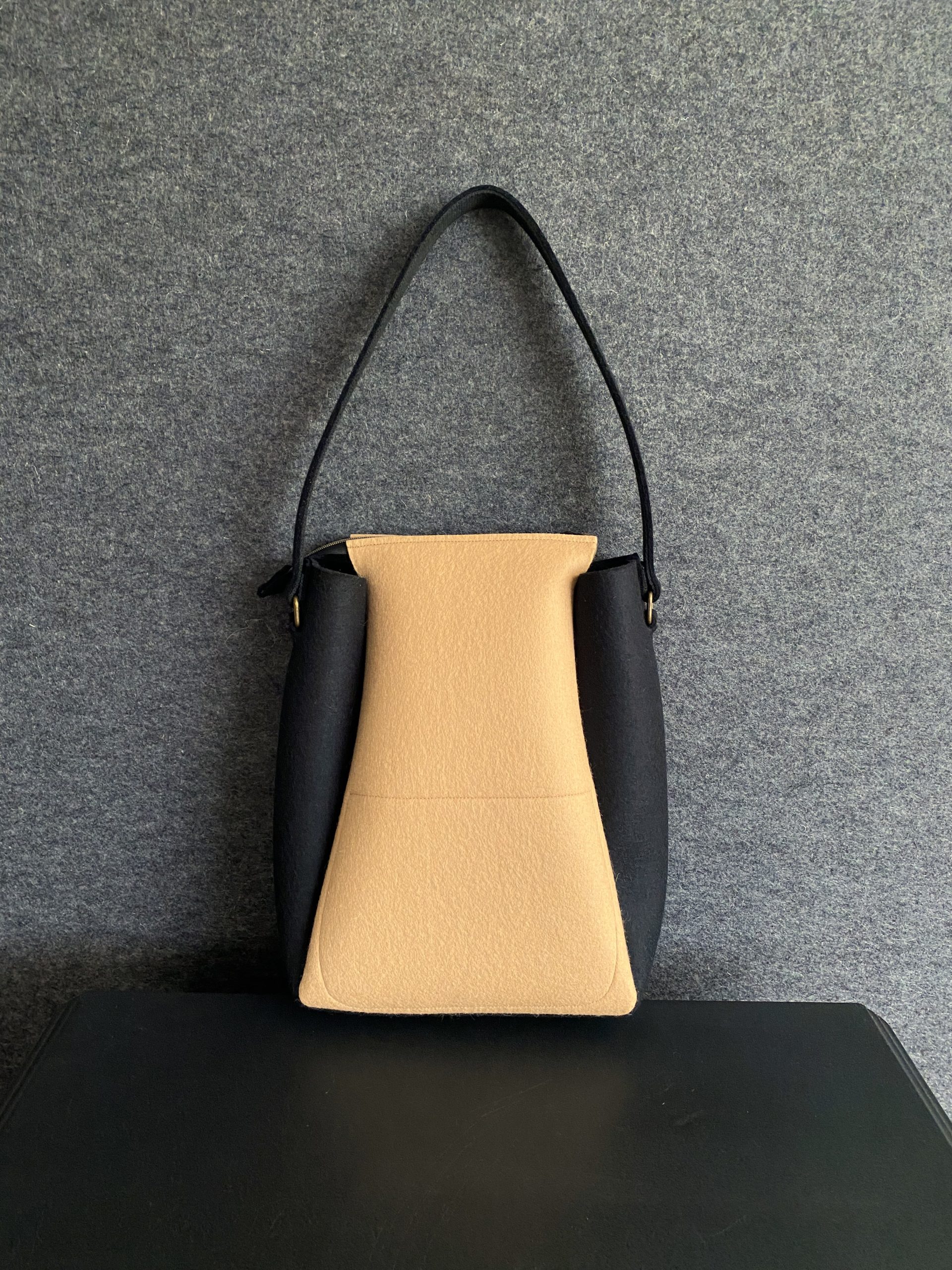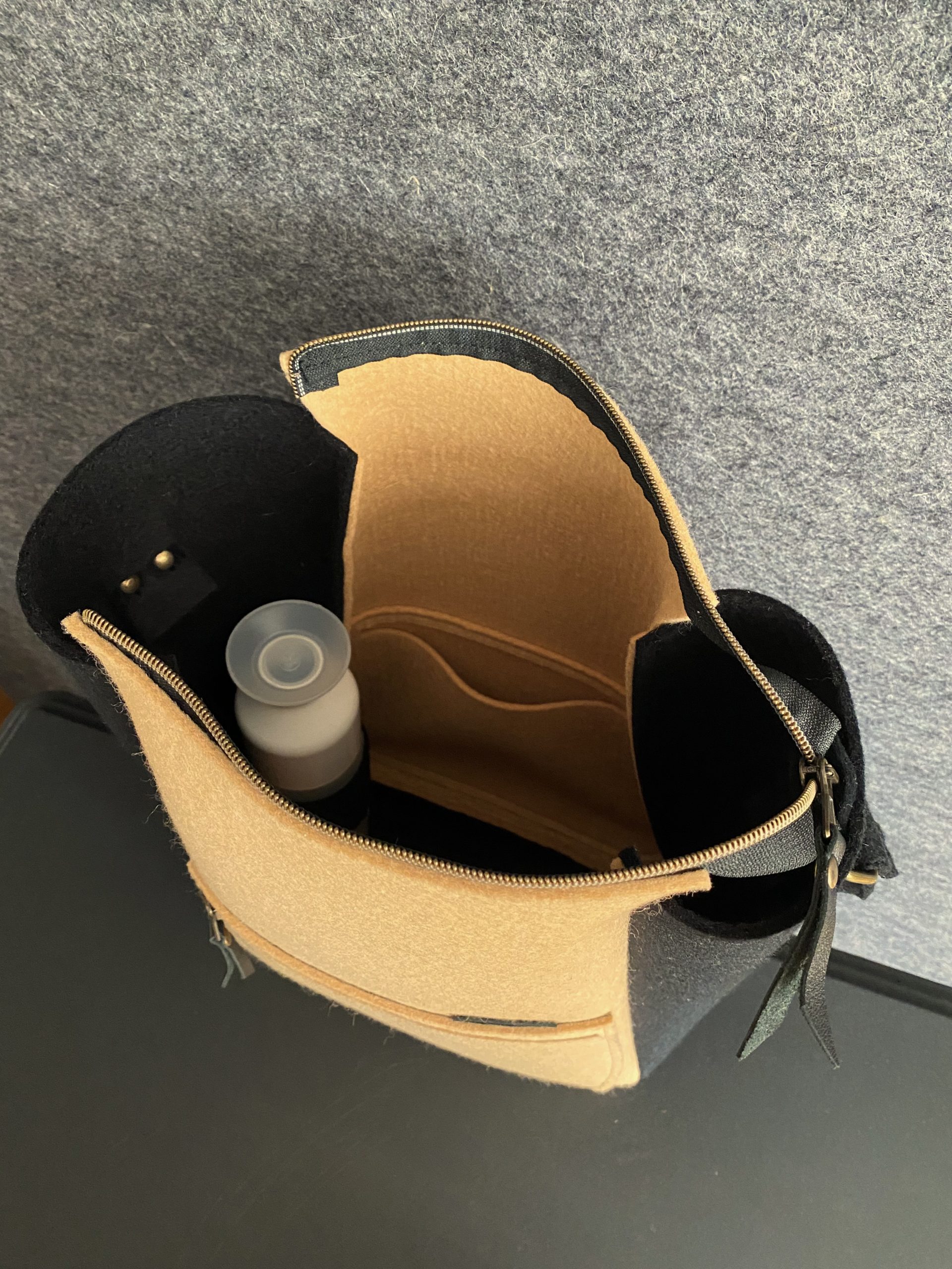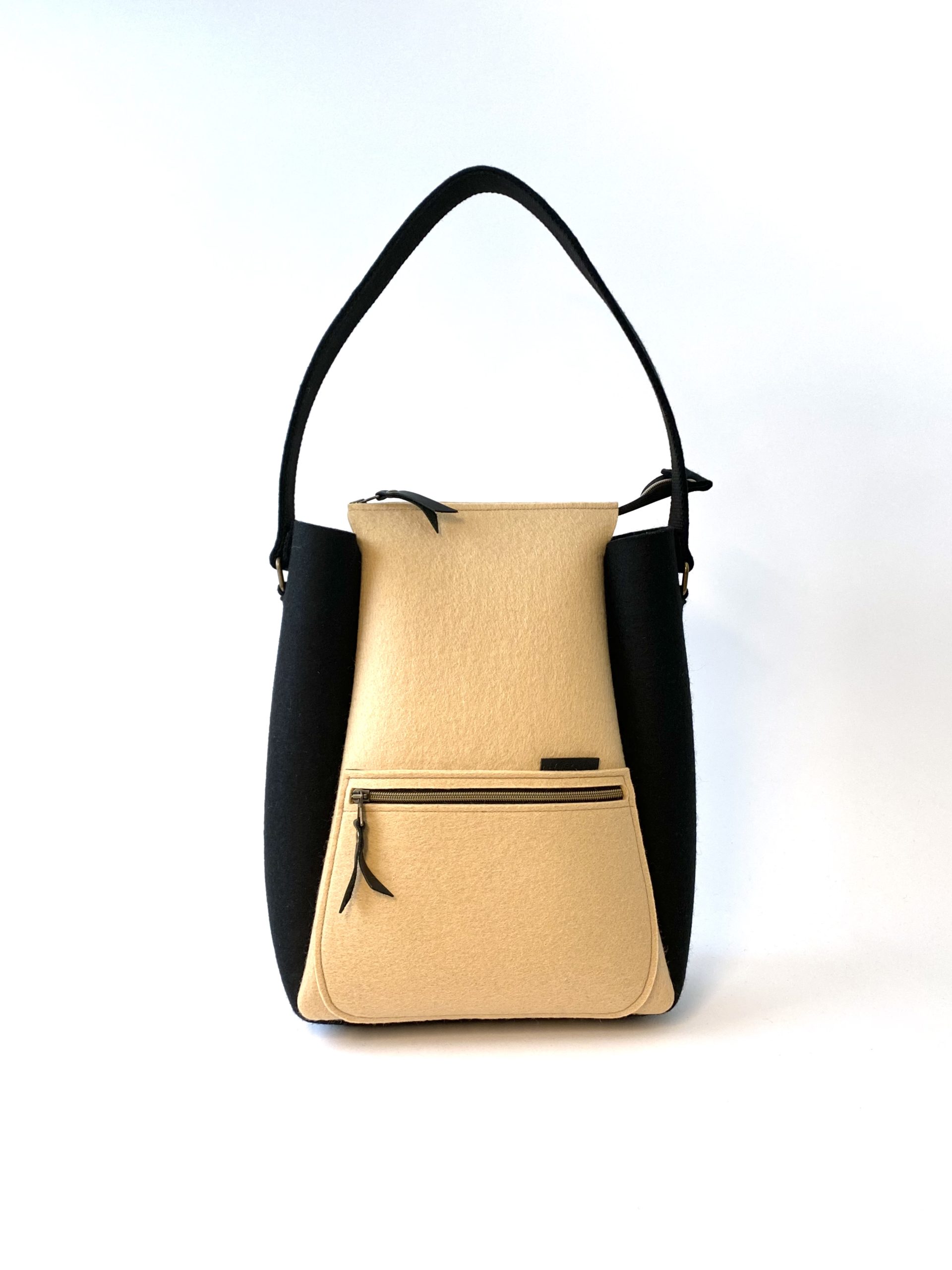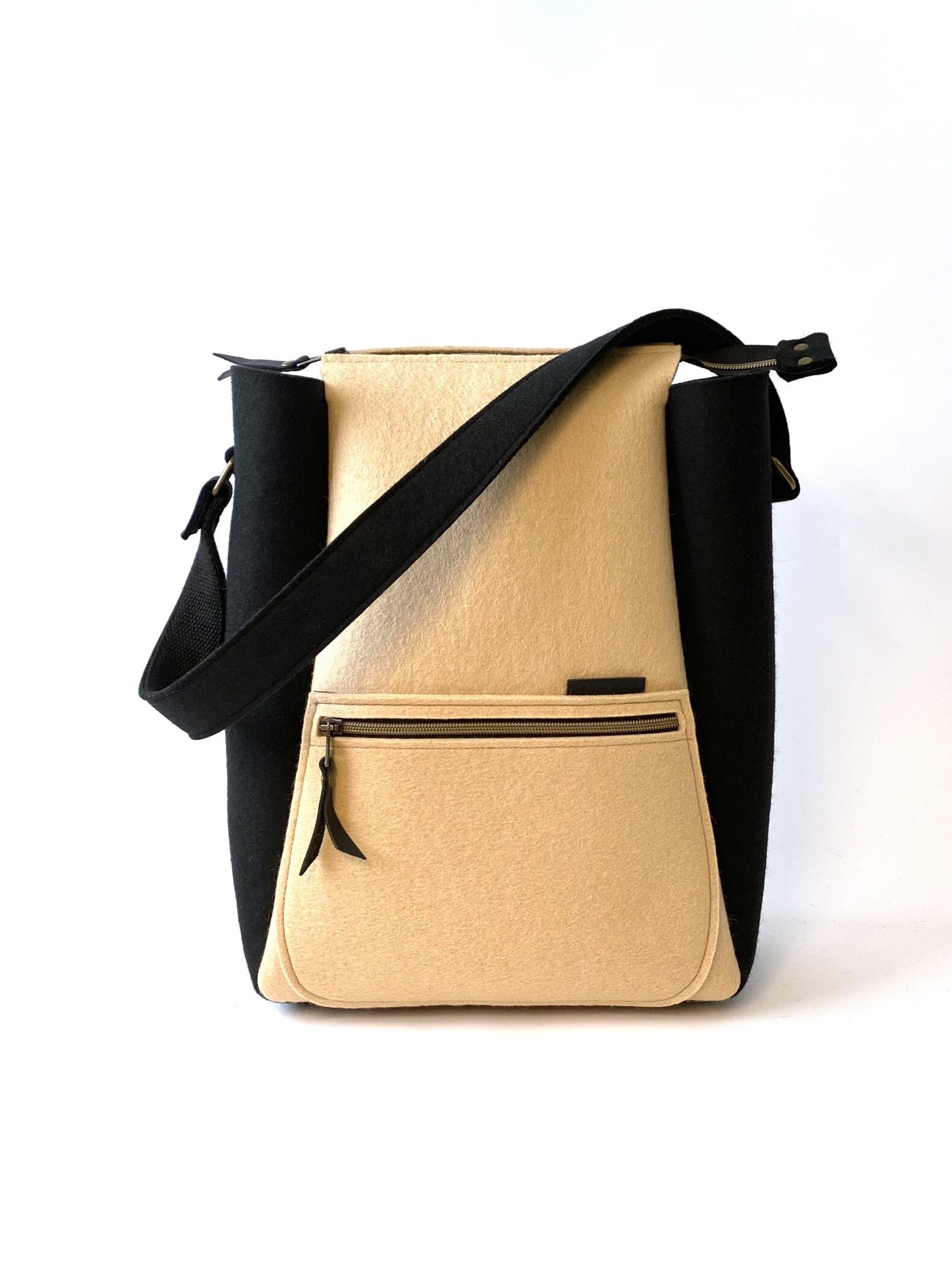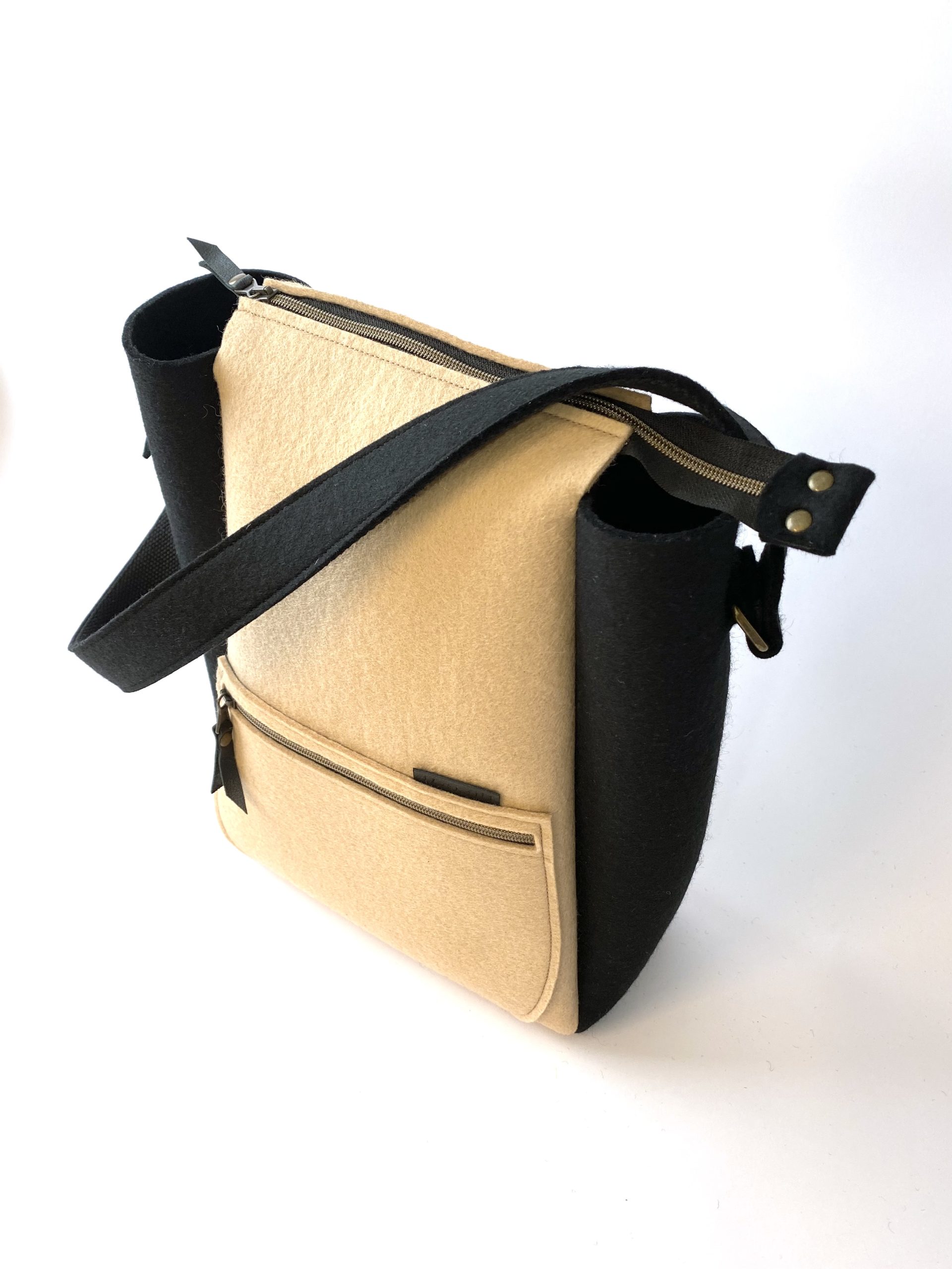 Schoudertas GRUTSK! is natuurlijk ook helemaal gemaakt van 3 mm dik (100%) wolvilt. De tas heeft 1 groot open vak, een open binnenvakje en aan de buitenkant een afsluitbaar vakje voor wat kleinere spullen. Binnenin zit nog een elastiek voor een (Dopper)flesje. Zo blijft alles netjes op zijn plek! Deze chique shopper is uitgevoerd in een exclusieve, zwart uni kleur, gecombineerd met lichtcamel wolvilt. En afgewerkt met zwart/bronzen details. Slow Made in 5 uur.