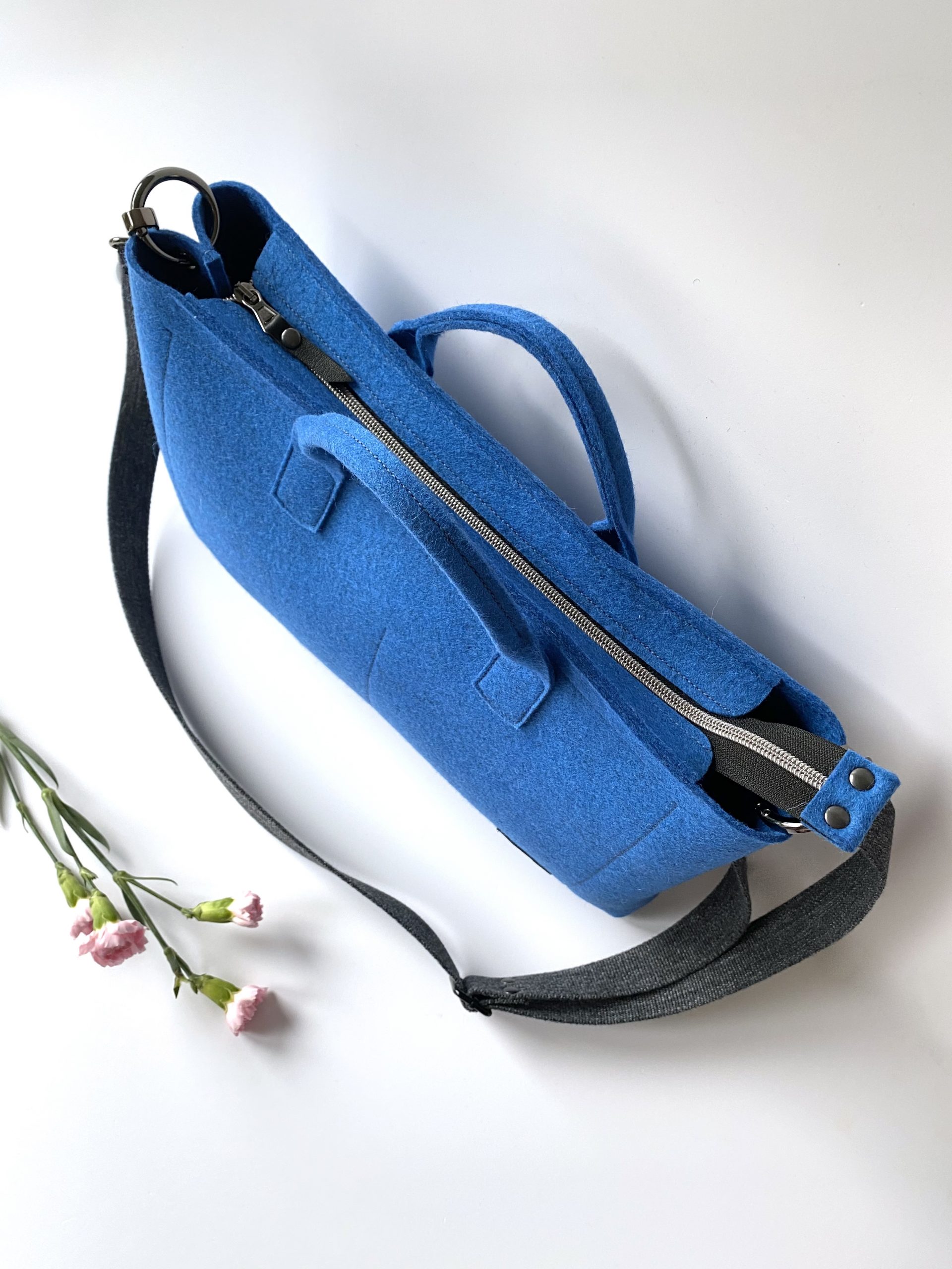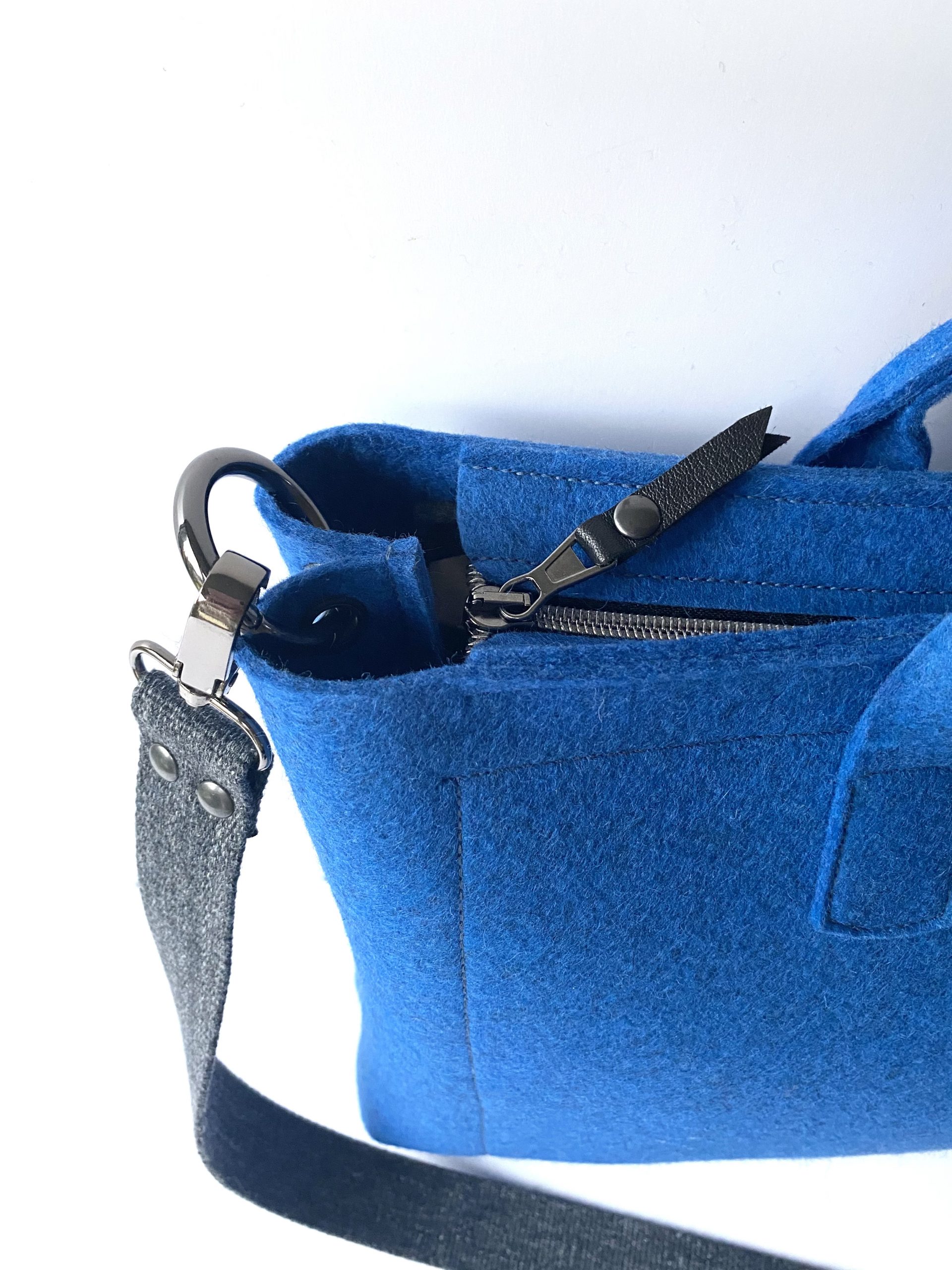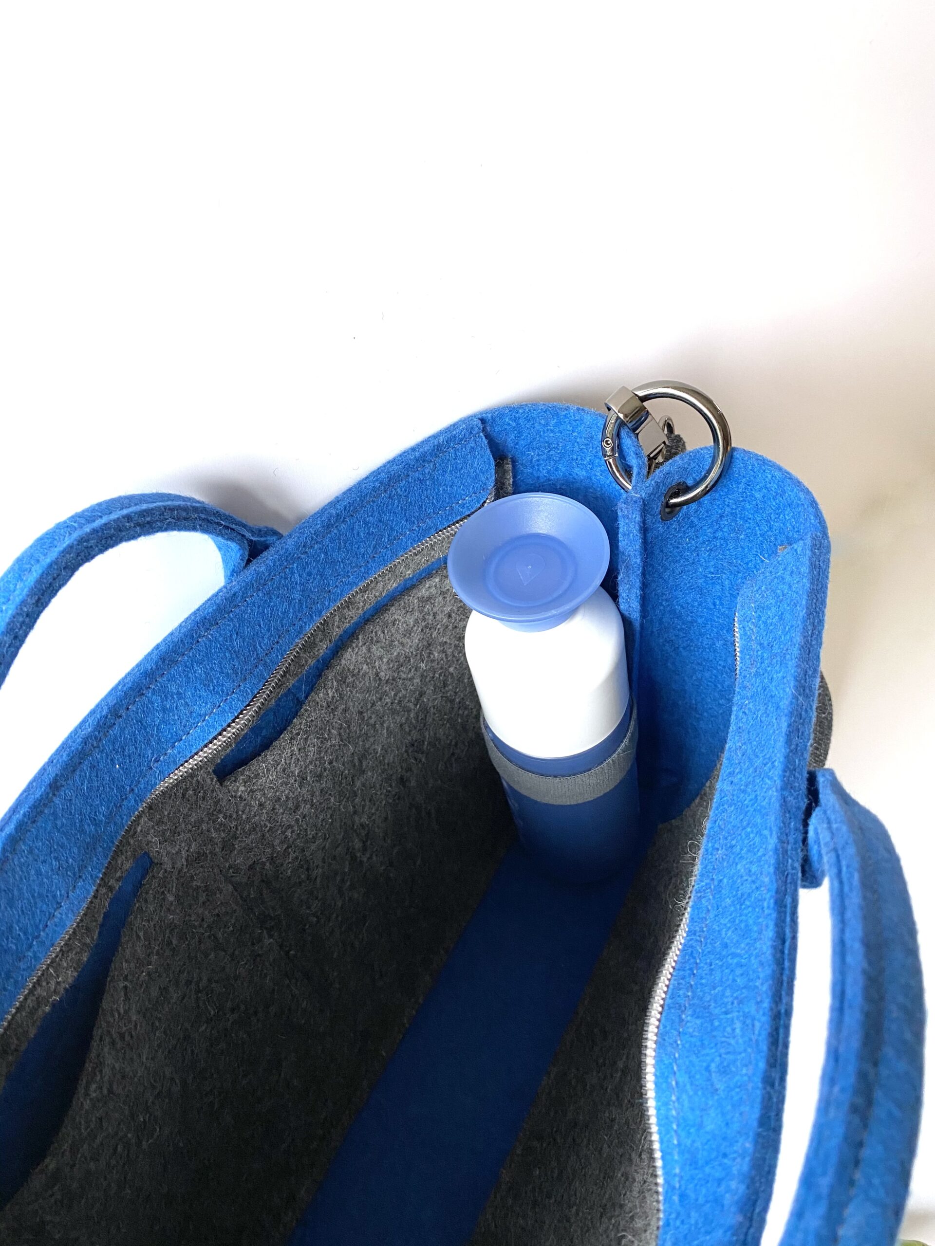 Om makkelijk en veilig een flesje water mee te nemen, heb ik een elastiek meegestikt (DOPPER formaat). De afgebeelde tas in blauw heeft een ritssluiting. Kies je ‘zonder ritssluiting’ dan heeft de tas een magneetsluiting. Natuurlijk is ook deze tas met veel liefde & aandacht gemaakt van 100% wolvilt. Slow Made in 8 uur.