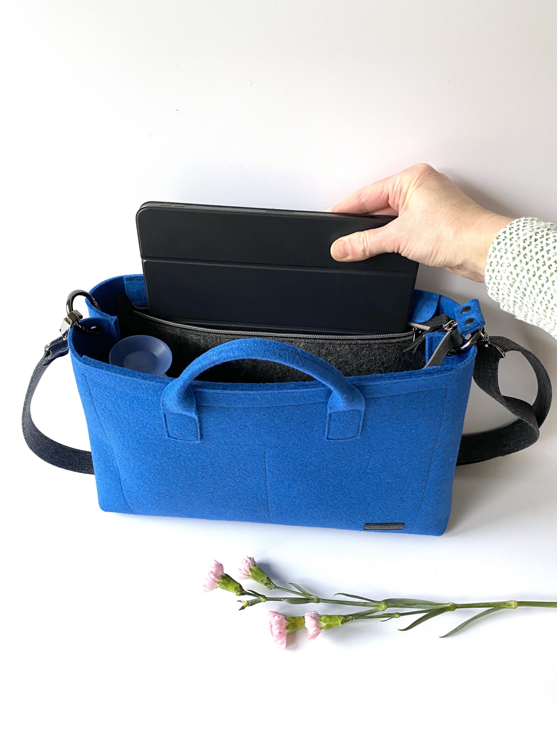 Deze schoudertas in de nieuwe kleur ‘azuurblauw’ is ietsje kleiner als model BOSK maar heeft wel een iets bredere bodem. Het heeft 2 donkergrijze stevige binnenvakken, waarvan 1 met rits, passend voor een tablet zoals de iPad Pro en de iPad Air. Het binnenvak aan de andere kant heeft open vakken.