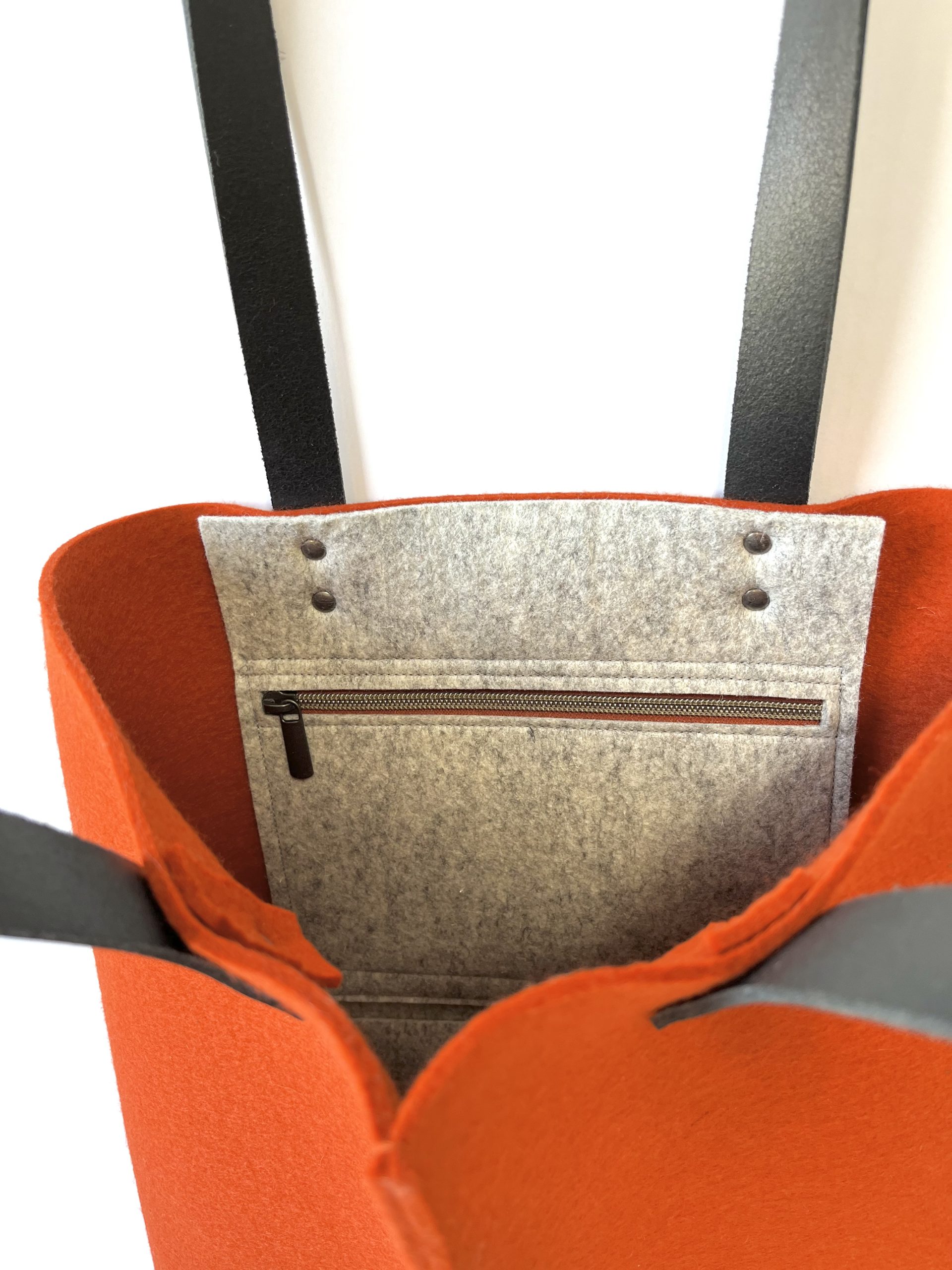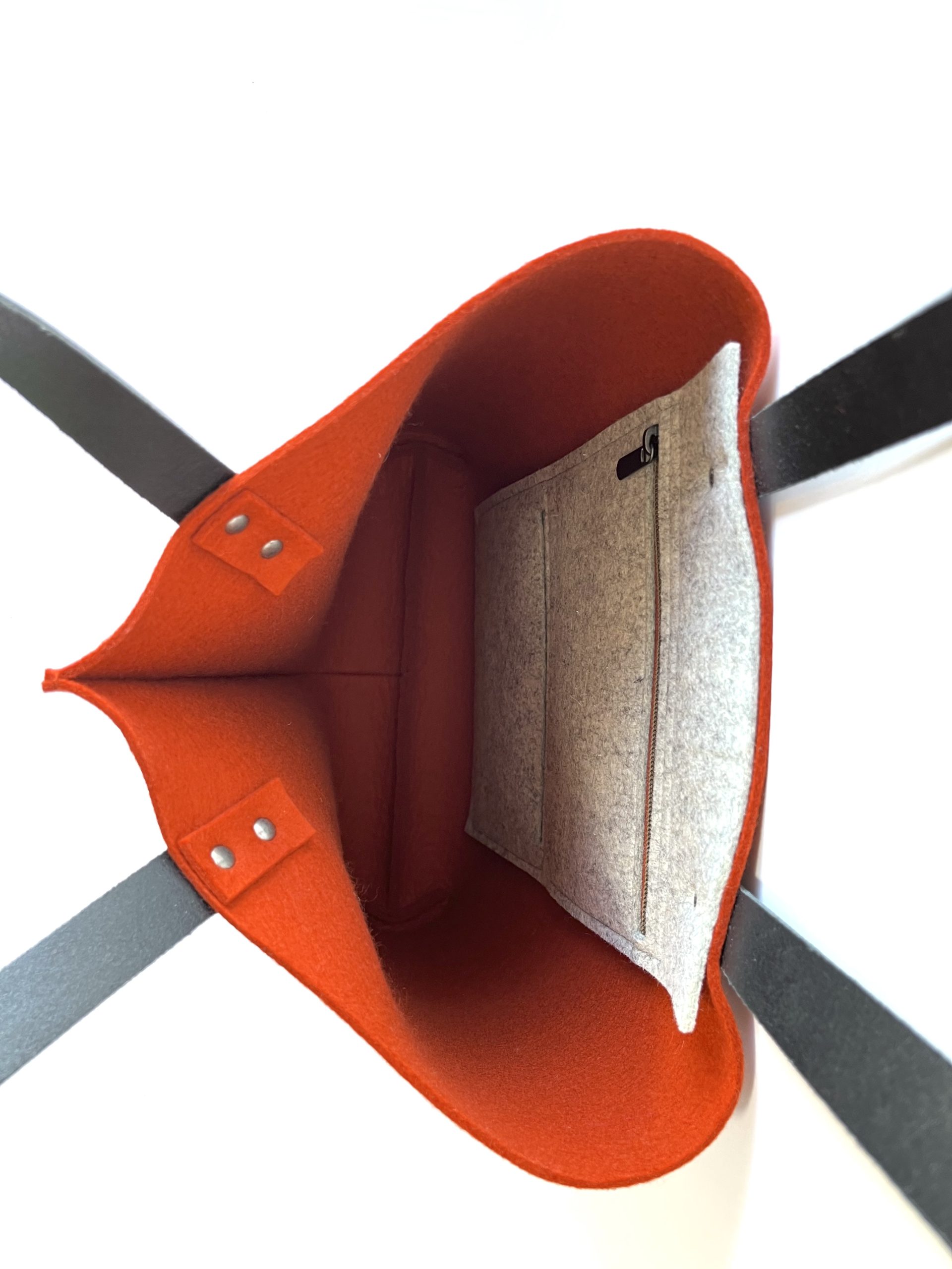 Schoudertas SIMMER is een tas zonder poespas, gemaakt van 3 mm dik 100% wolvilt. Deze tas heeft 1 groot open vak en een binnenvak met een afsluitbaar en een open vak in een bijpassende kleur vilt. Wat heb je meer nodig? Slow Made in 5 uur.