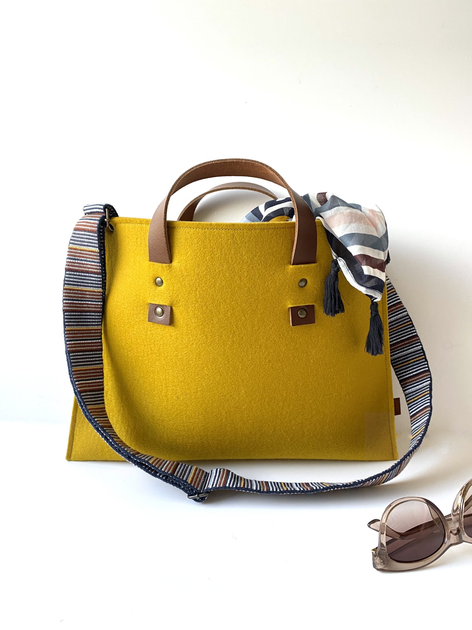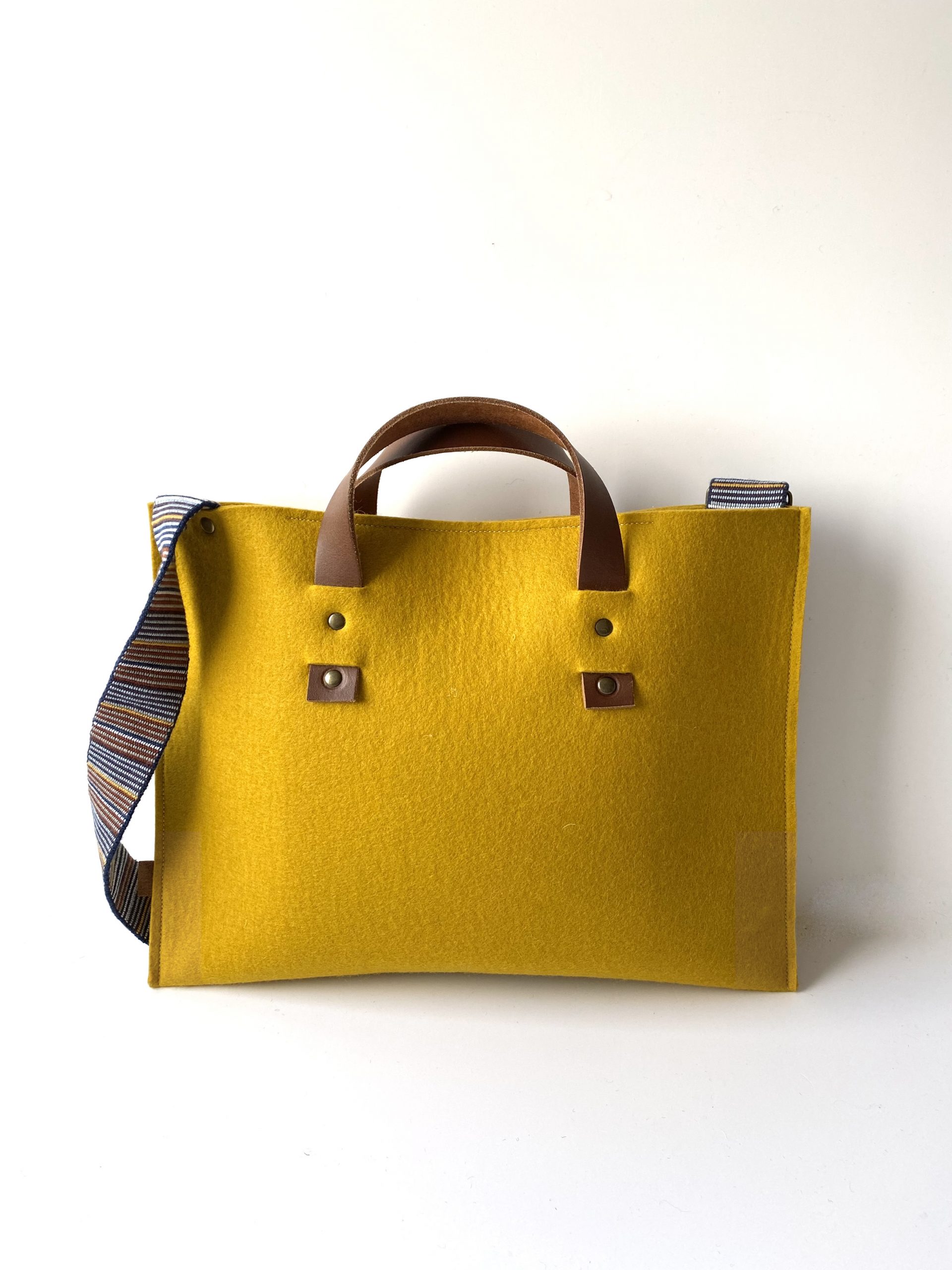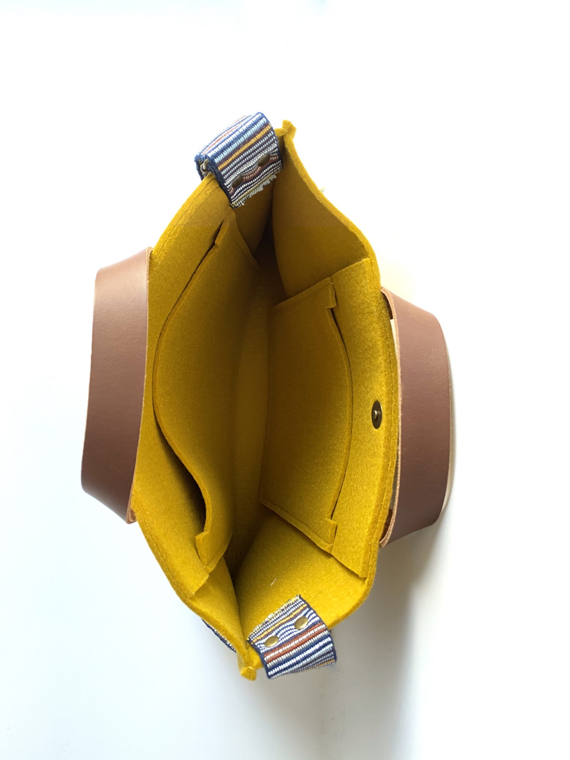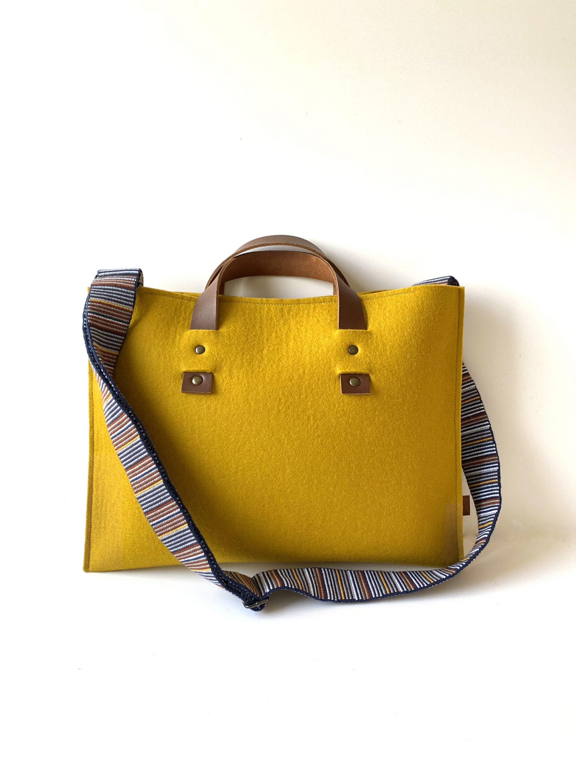 Deze okergele tas is gemaakt van 100% wolvilt. Buiten het grotere vak, zitten er aan de zijkanten twee open binnenvakken. Met lederen handhengsels en vaste, brede en verstelbare schouderband. Bij deze schouderband past ook mooi de kleur ‘azuurblauw’ en ‘lichtgrijs gemêleerd’. Maar er zijn ook 2 nieuwe schouderbanden binnen met 2 verschillende kanten (laatste foto). Keuze uit diverse kleurencombinaties dus. Slow Made in 6 uur.
