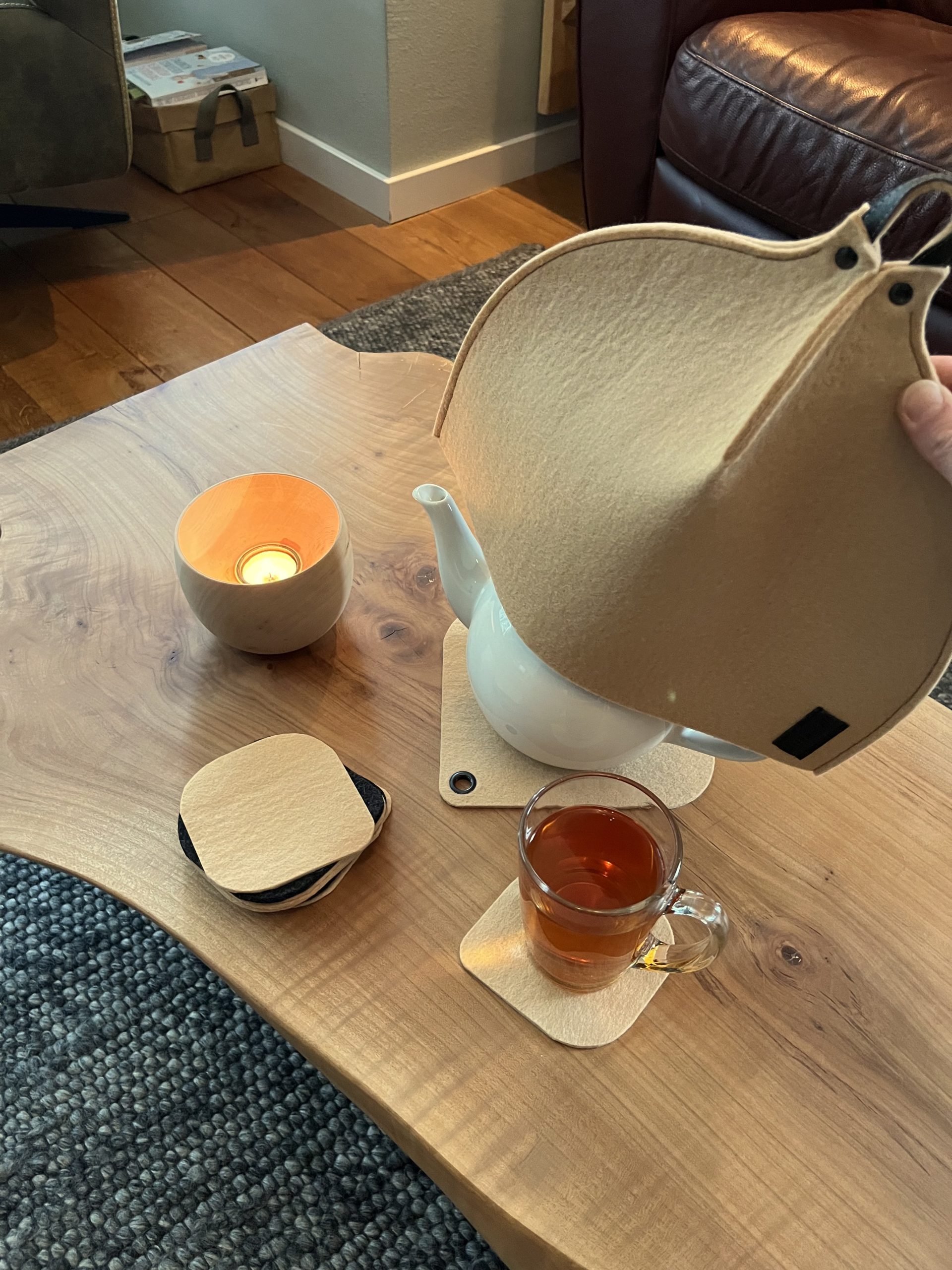 Cadeauset: Design Theemuts MÛTSE mét onderzetters – handmade van 100% puur wolvilt
