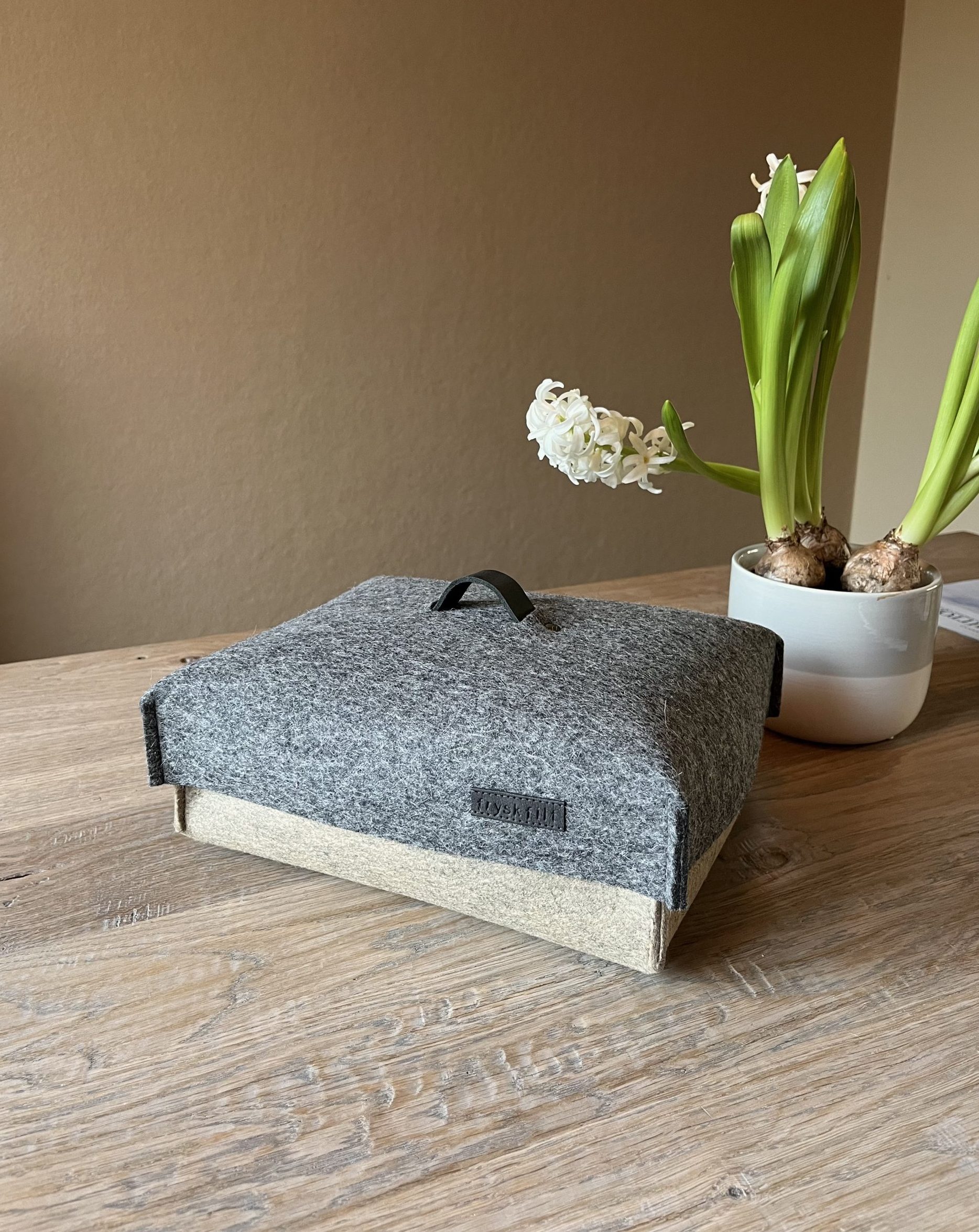 Manden genoeg te koop in de wereld. Maar een mand van wolvilt mét een deksel? Die zijn er niet zoveel! Vooral in gemêleerde kleuren zijn deze manden mooi stevig en er kan van alles in… brillen, oplaadsnoeren, tablets, zakdoekjes en alles wat je toch graag bij de hand hebt. Kies je eigen kleur/kleurencombinatie: Vermeld bij ‘bestelnotities’ (2e fase van het bestellen) welke kleur je wilt voor de mand, en welke kleur voor het deksel. Afgebeeld in maat L.